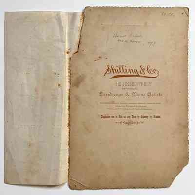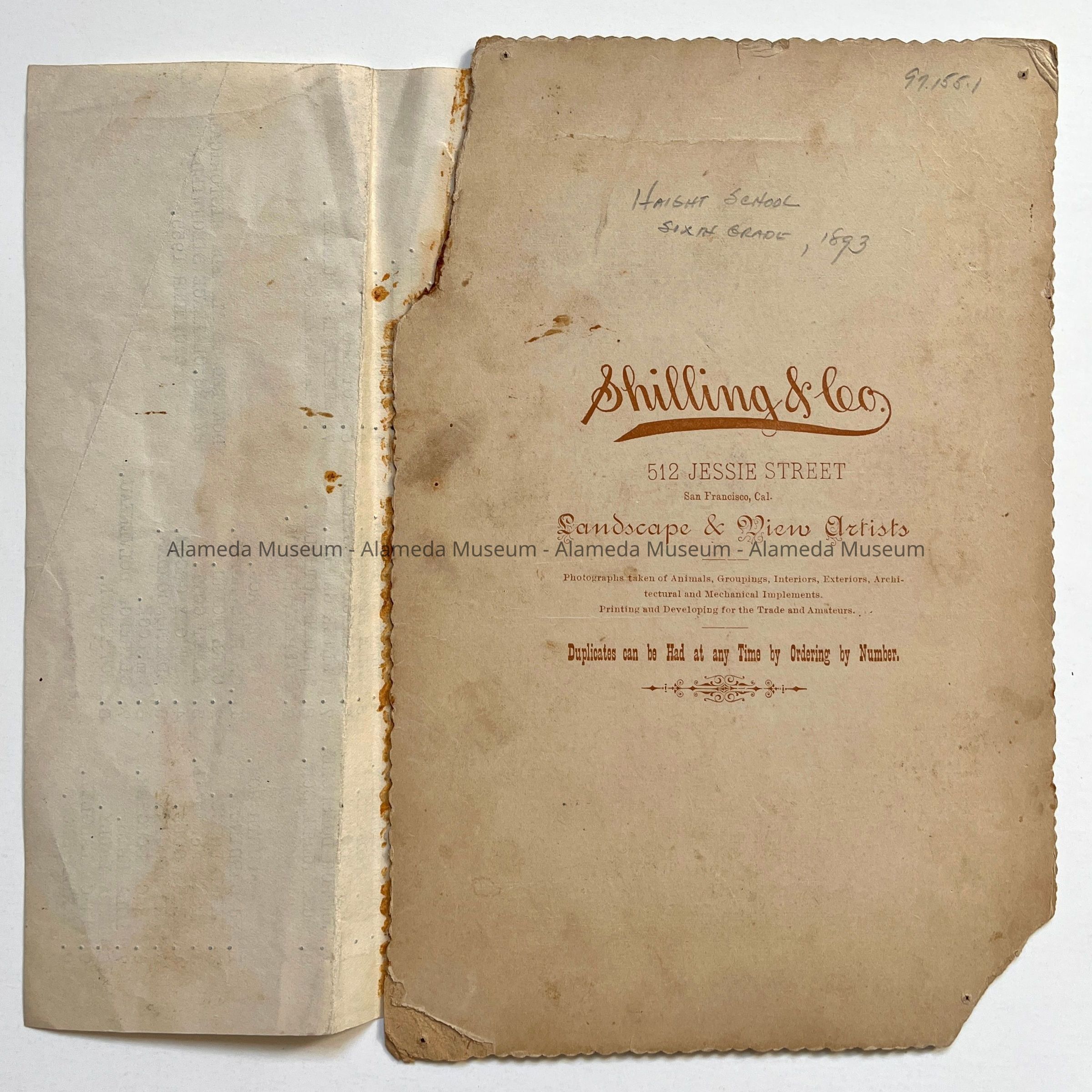 Description: Sepia-toned albumen print photo mounted on tan paperboard. Photographer: Shilling & Co., SF (per imprinting on front mounting). The mounting has been damaged by the attachment of a white typewritten description label (L-4 1/2 x W-8 1/2 in.) along the bottom margin, missing the upper left and bottom right corners, an old geen cataloging label, and spotting.