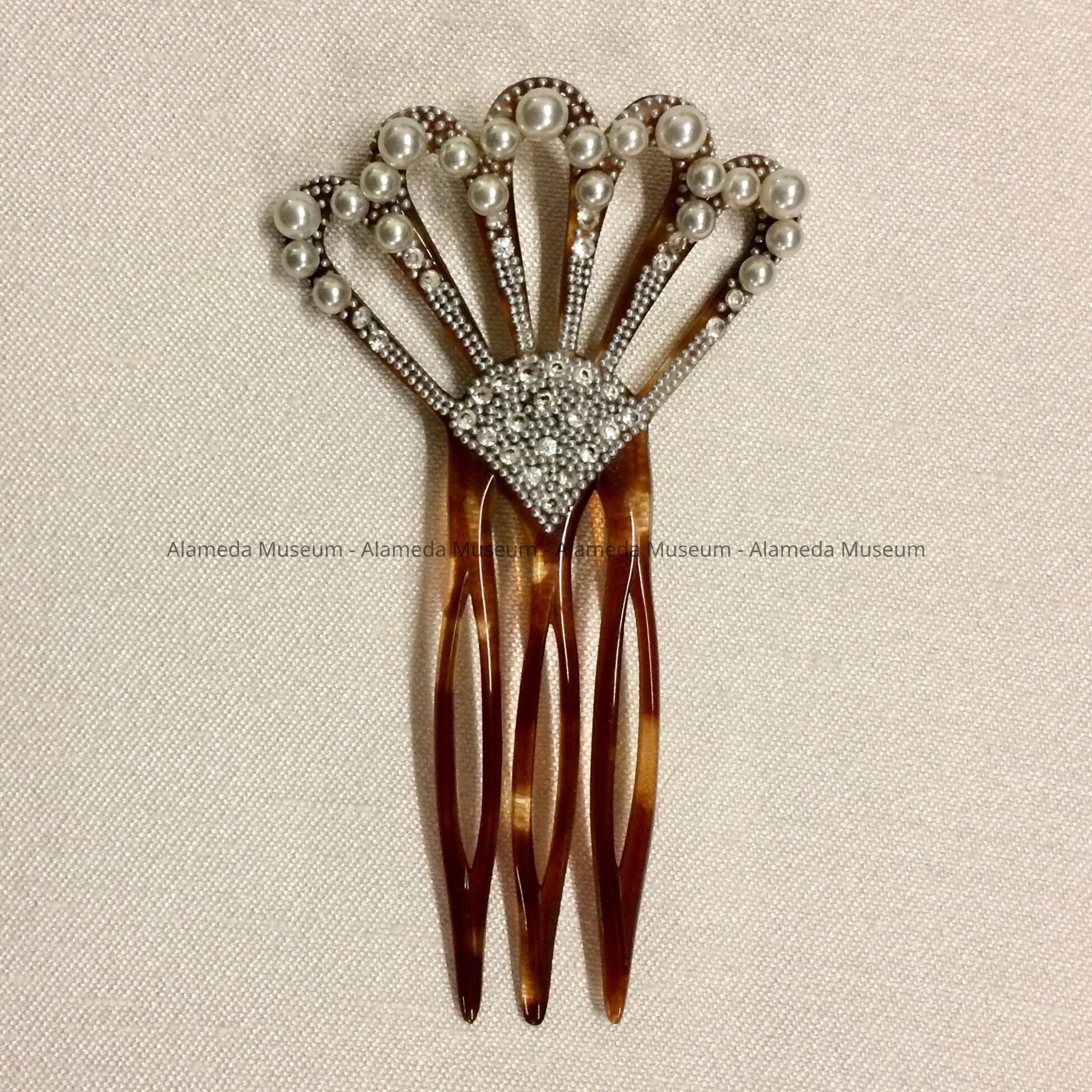 Description: celluloid tortoise three-pronged hair comb with open-worked prongs, and art-deco design of five arches decorated with glued-on artificial pearls, silver pinpoints, and diamant-cut crystals or glass. Verso has a hallmark, with central 'EGF', and other words (more research needed).