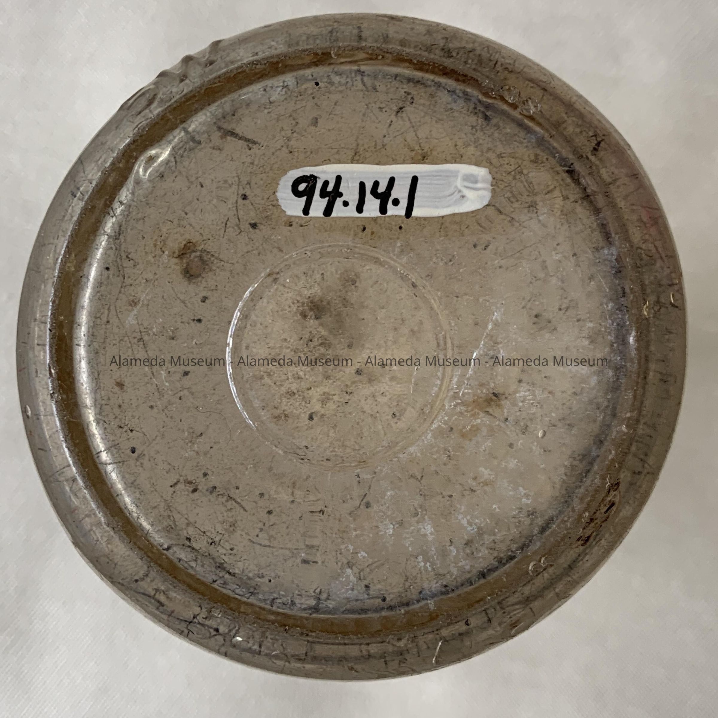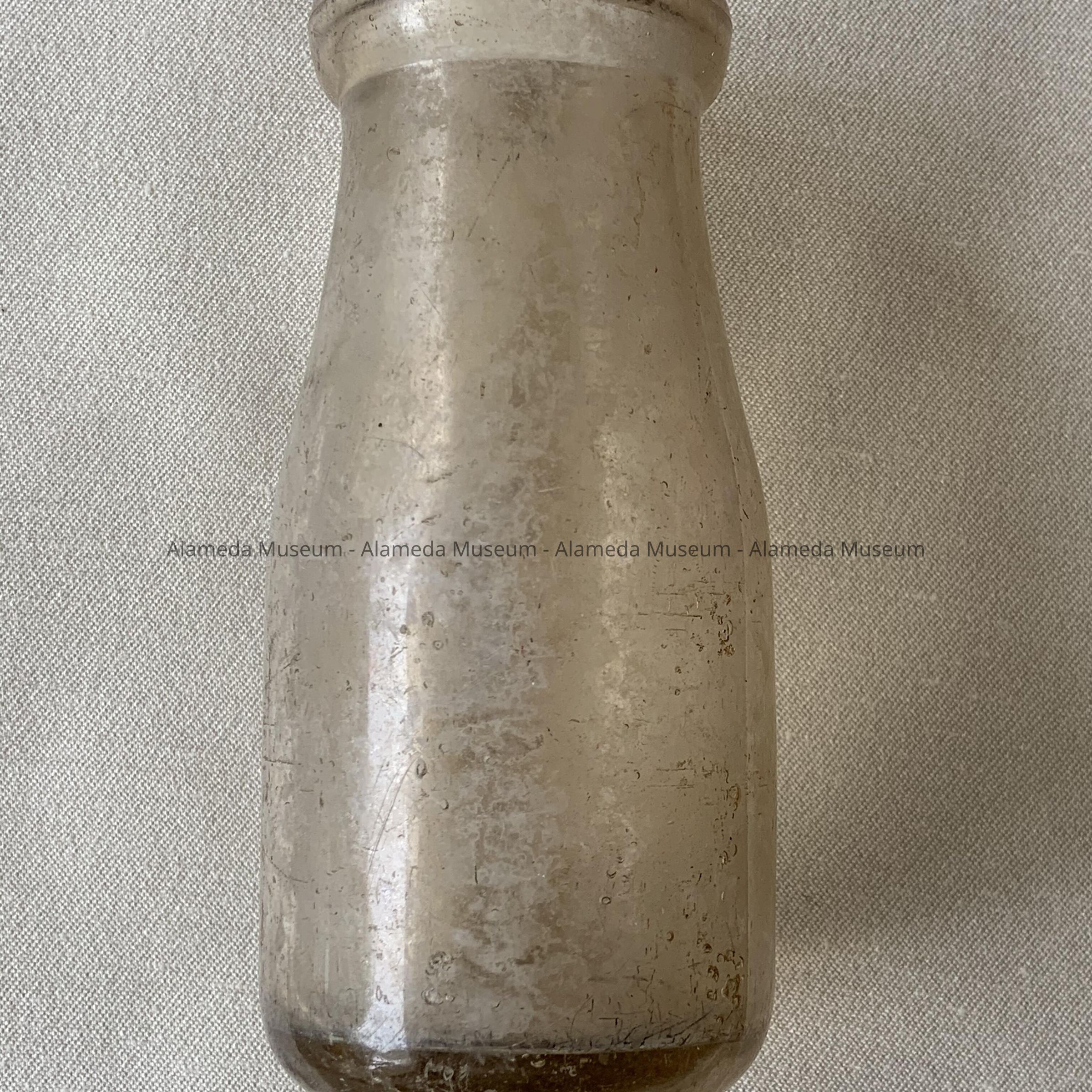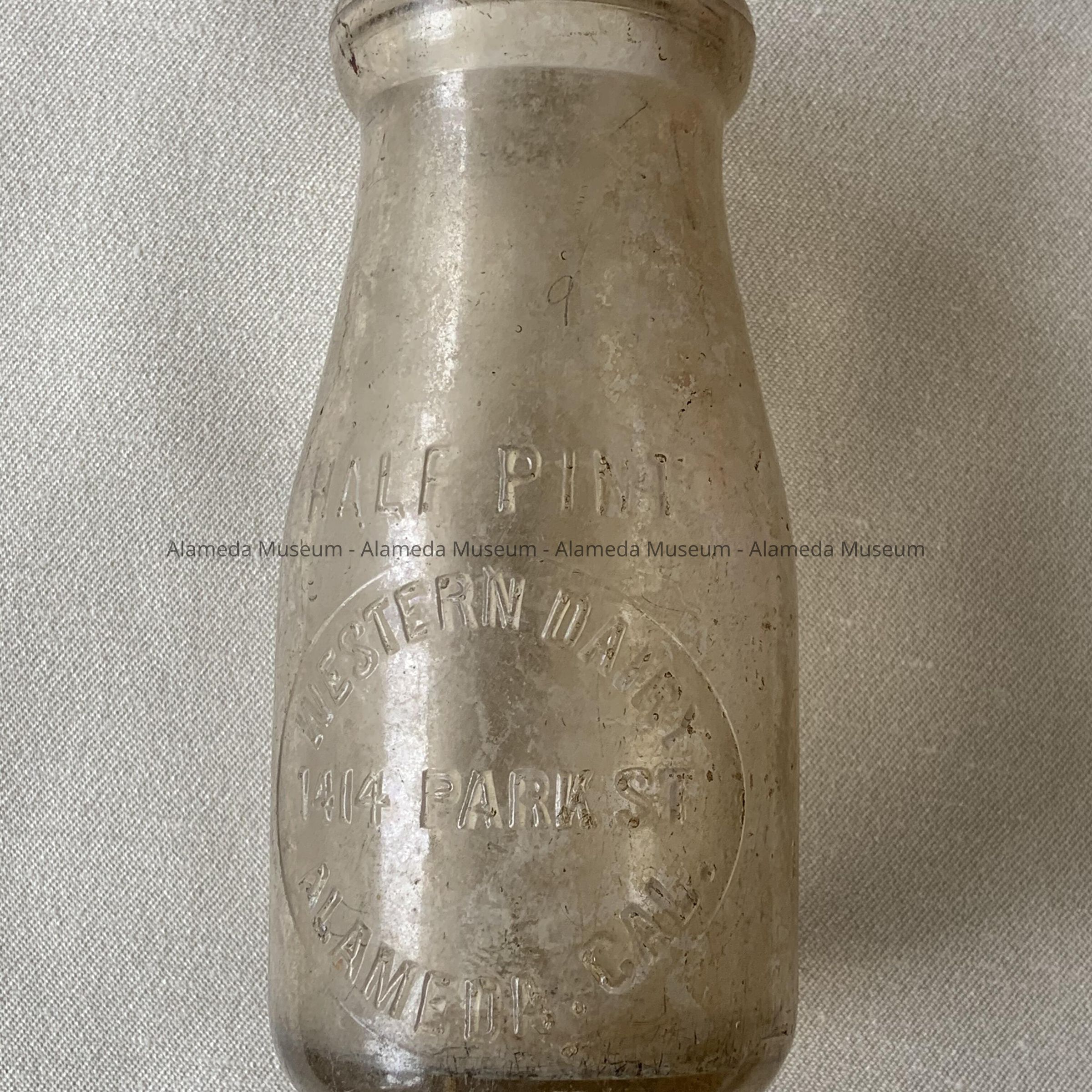 Description: Half-pint clear glass cream bottle with embossed lettering stating "Western Dairy, 1414 Park St., Alameda, CAL." Signed on base (embossed letter) "DELAVAL."