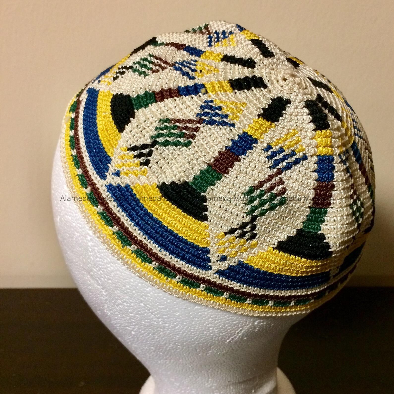SKULL CAP WHICH APPEARS TO BE HAND-CROCHETED FROM YARN IN GREEN, YELLOW, RUST, AND BLACK COLORS ON AN OFF-WHITE-COLORED BACKGROUND. POSSIBLY OF EGYPTIAN ORIGIN.