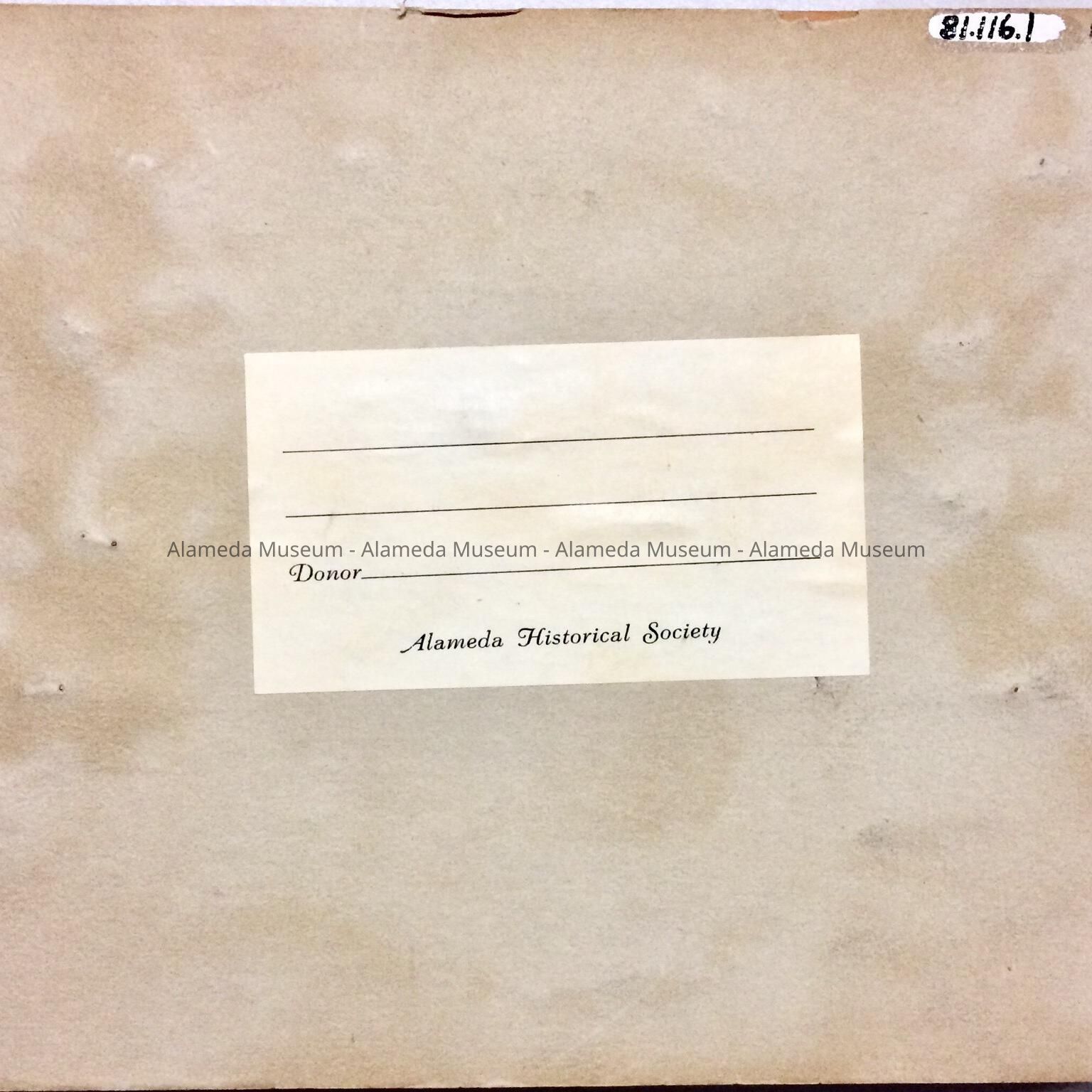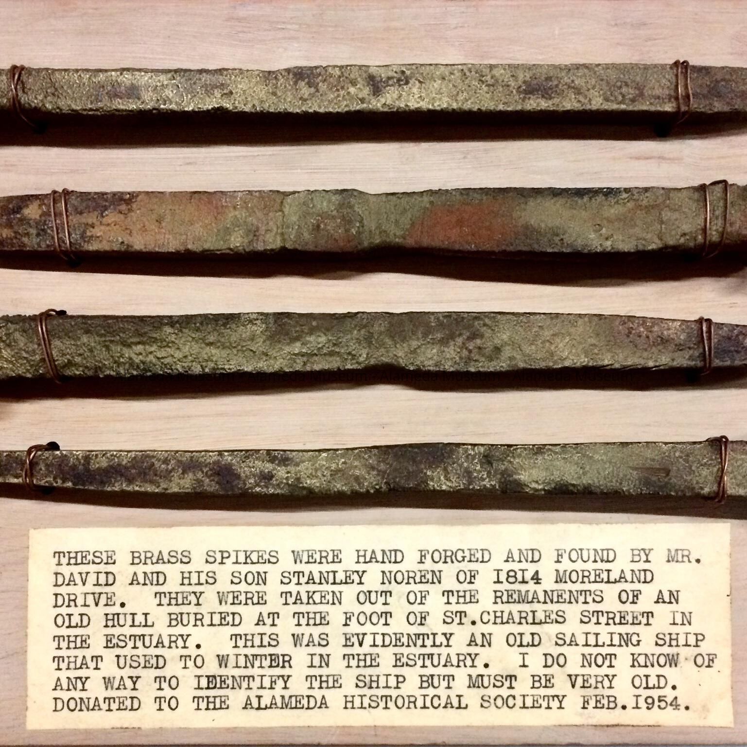 THESE BRASS SPIKES WERE HAND FORGED AND FOUND BY MR. DAVID AND HIS SON STANLEY NOREN OF I814 MORELAND DRIVE. THEY WERE TAKEN OUT OF THE REMANENTS OF AN OLD HULL BURIED AT THE FOOT OF ST. CHARLES STREET IN THE ESTUARY. THIS WAS EVIDENTLY AN OLD SAILING SHIP THAT USED TO WINTER IN THE ESTUARY. I DO NOT KNOW OF ANY WAY TO IDENTIFY THE SHIP BUT MUST BE VERY OLD. DONATED TO THE ALAMEDA HISTORICAL SOCIETY FEB. 1954.