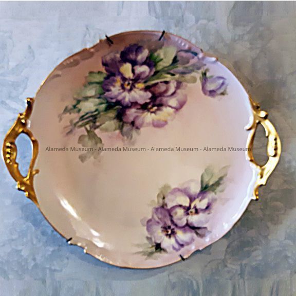 Description: Hand-painted Limoges cake plate with purple pansies and open handles trimmed in gold.
