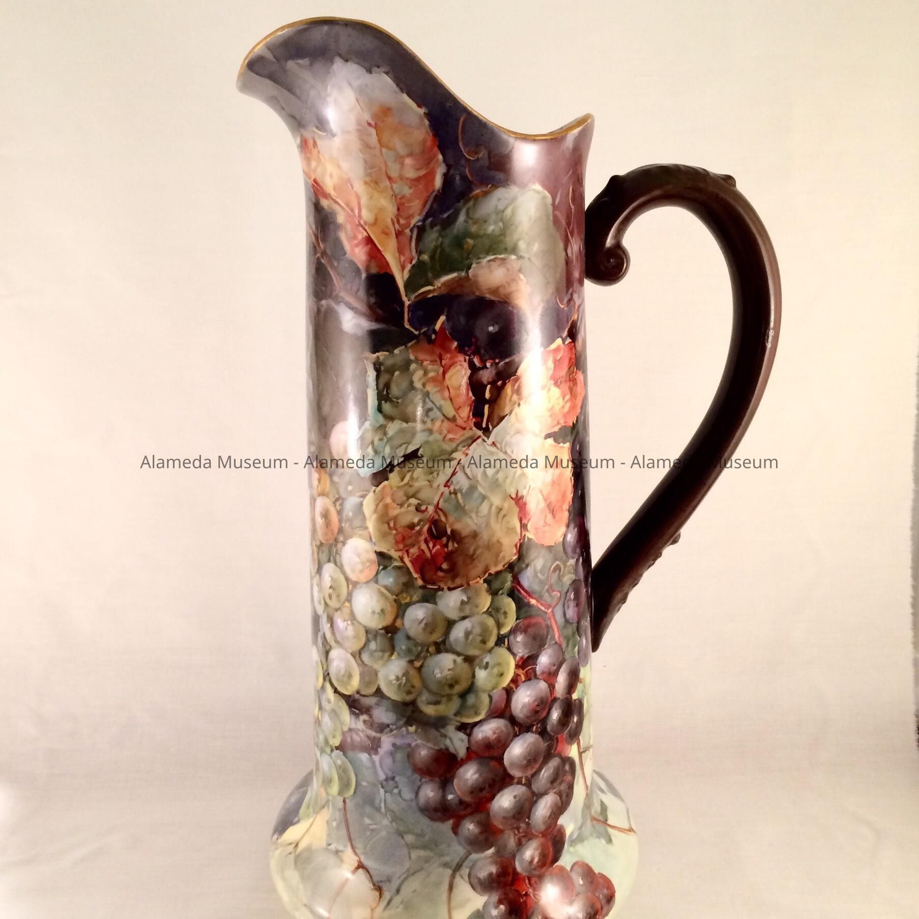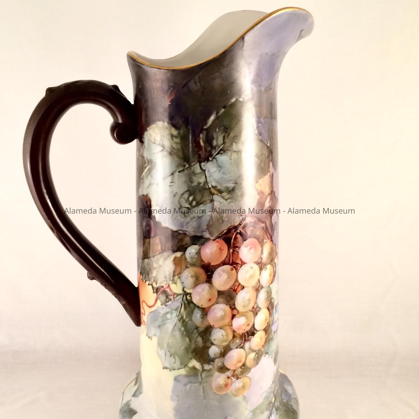 Description: A tall hand painted pitcher with a large spout, attached handle, and a flared bottom. The base is signed "J. Klaus” and “France”, but the subsequent lettering is illegible. The painted decoration is a green and purple cluster of green and purple grapes with a background of various colored leaves.