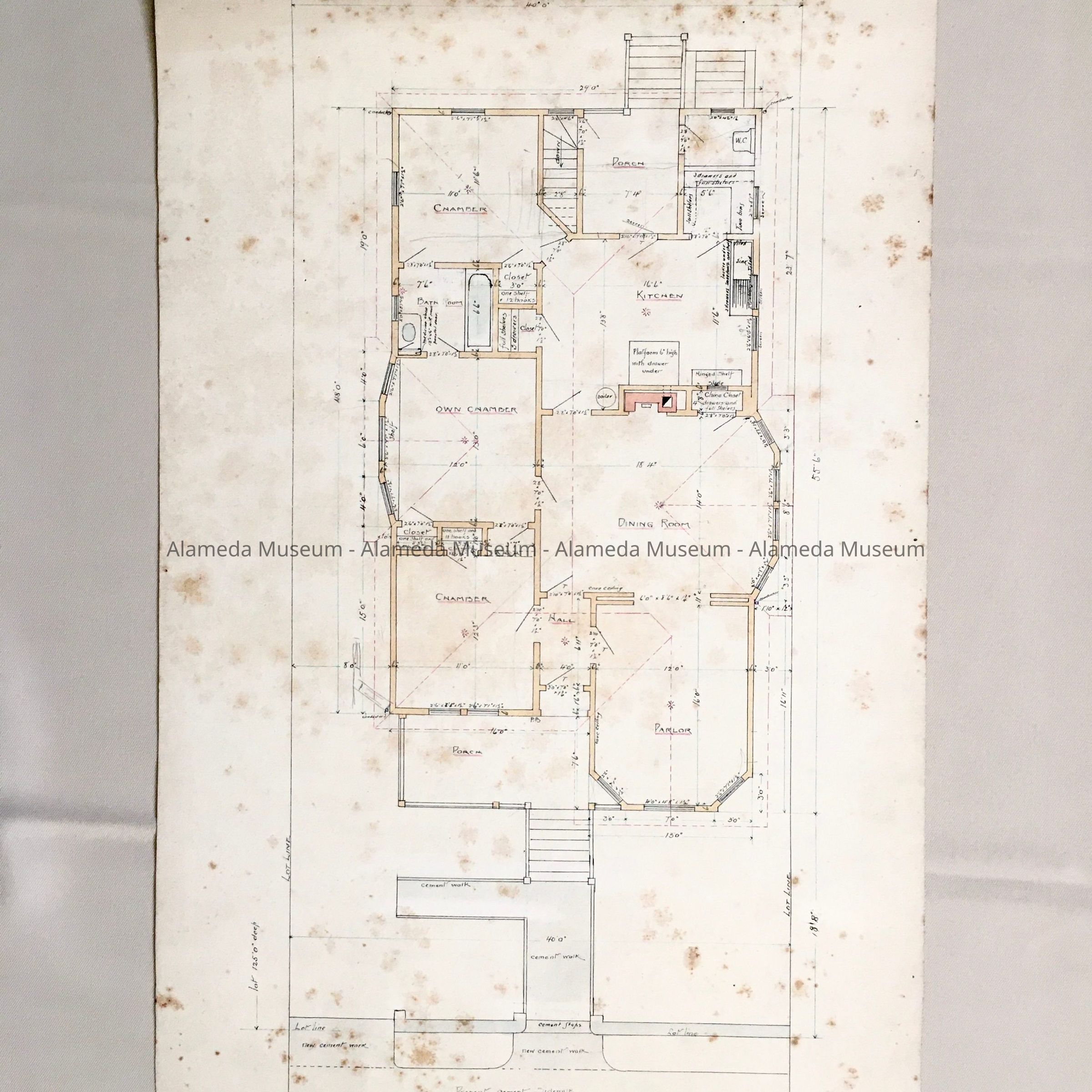 HISTORY OF OBJECT: A HAND-DRAWN ARCHITECTURAL PLAN SIGNED BY ARCHITECT HENRY H. MEYERS, A RESIDENCE IN AN UNKNOWN LOCATION, POSSIBLY IN ALAMEDA. THE DRAWING APPEARS TO BE AN EARLY WORK OF HENRY H. MEYERS.