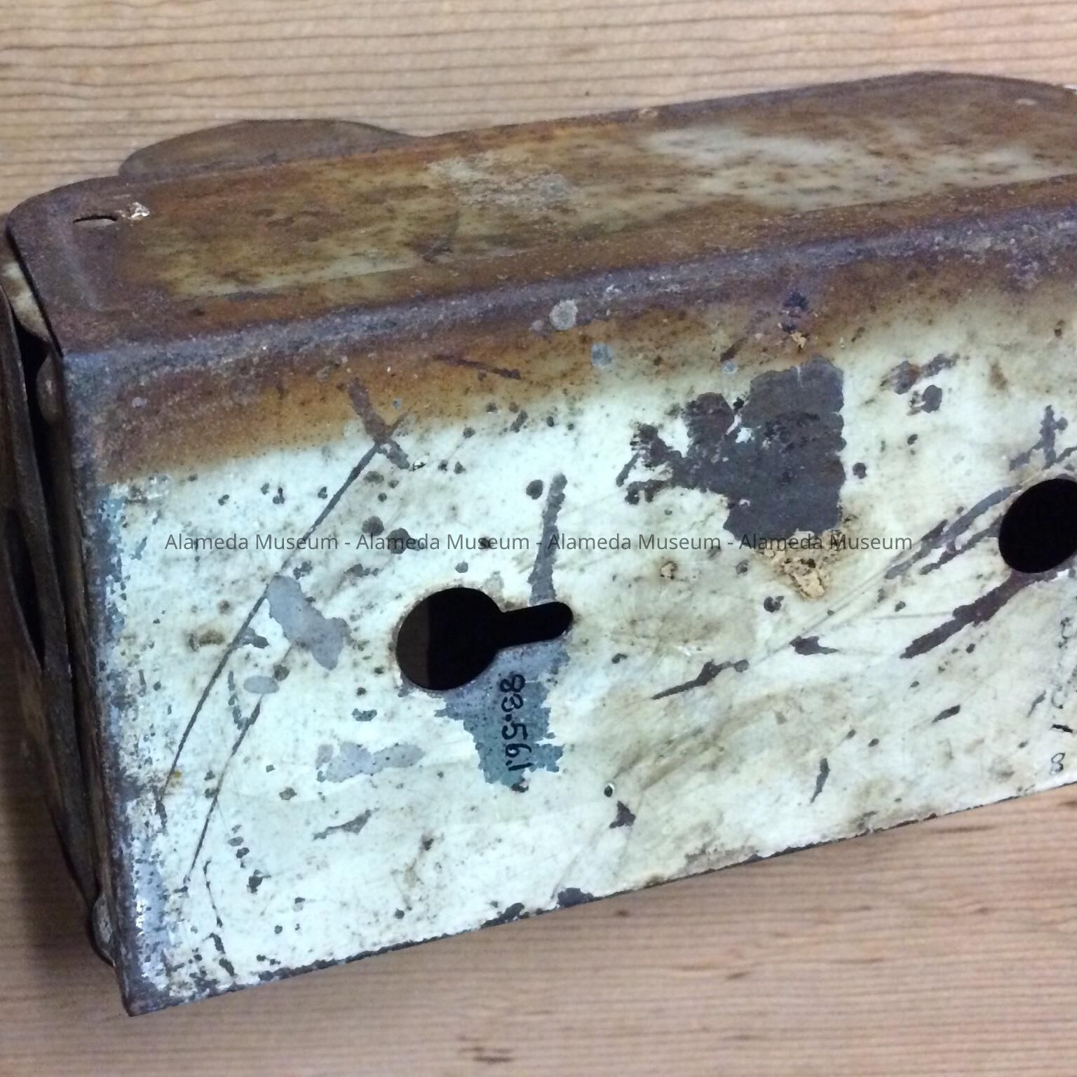 Description: Hanging match box fabricated from tin with lithograph transfer (black & yellow) stating "Finest Grades Coal, Wood-Coal-Feed, Phones-Alameda-9, Alameda-10, 2314 Santa Clara Avenue, Alameda, Calif." Reverse side pierced for hanging. Size, 5 1/4 inches in length, 1 3/4 inches in depth.