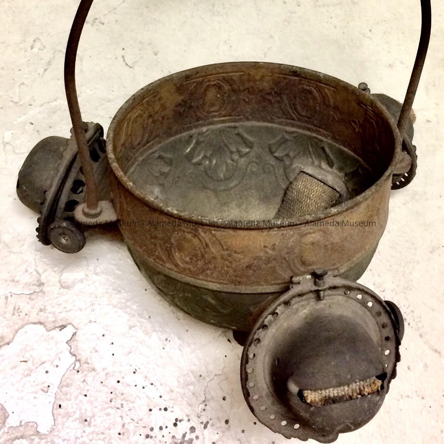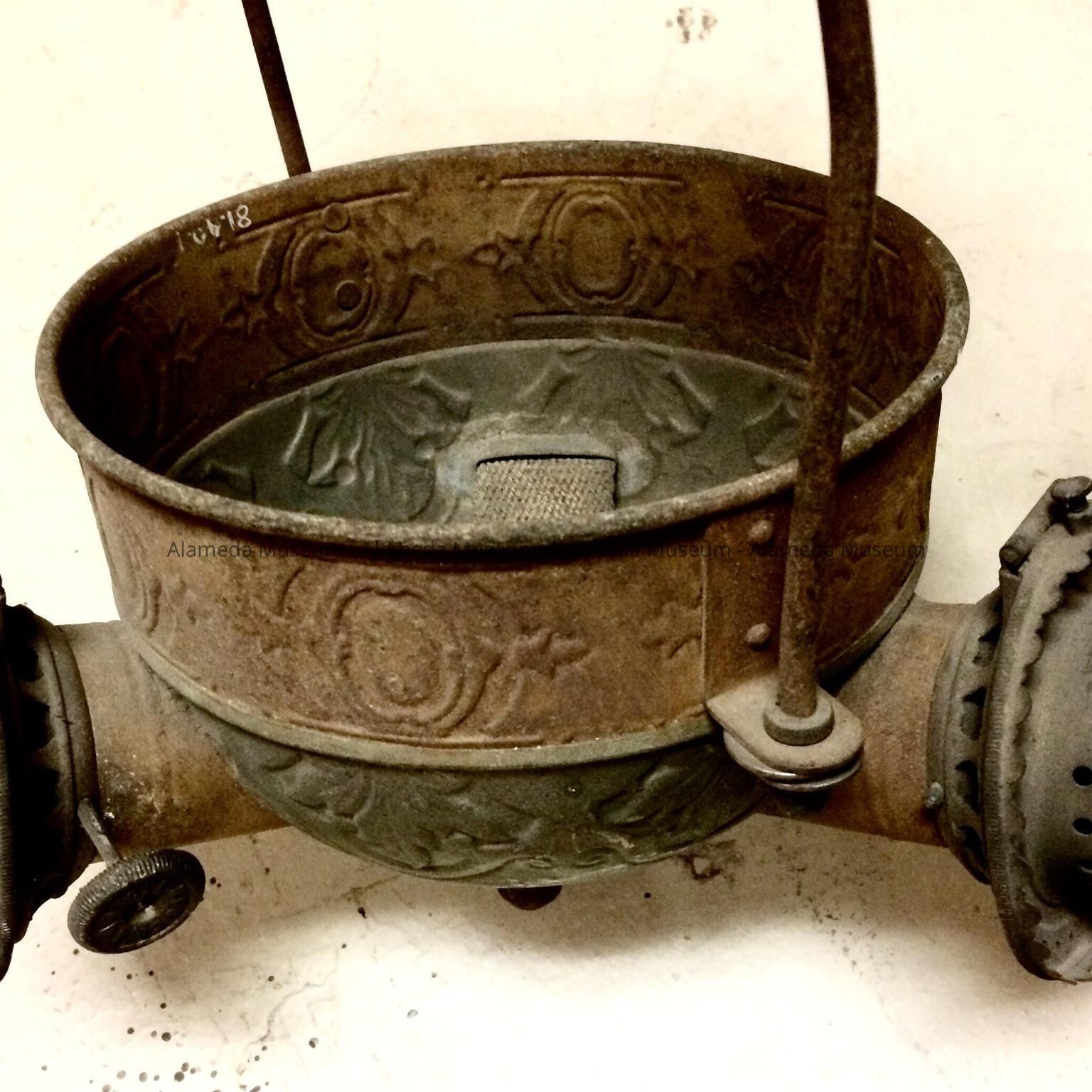 [A galvanized steel hand lamp from the home of early Alameda residents.]