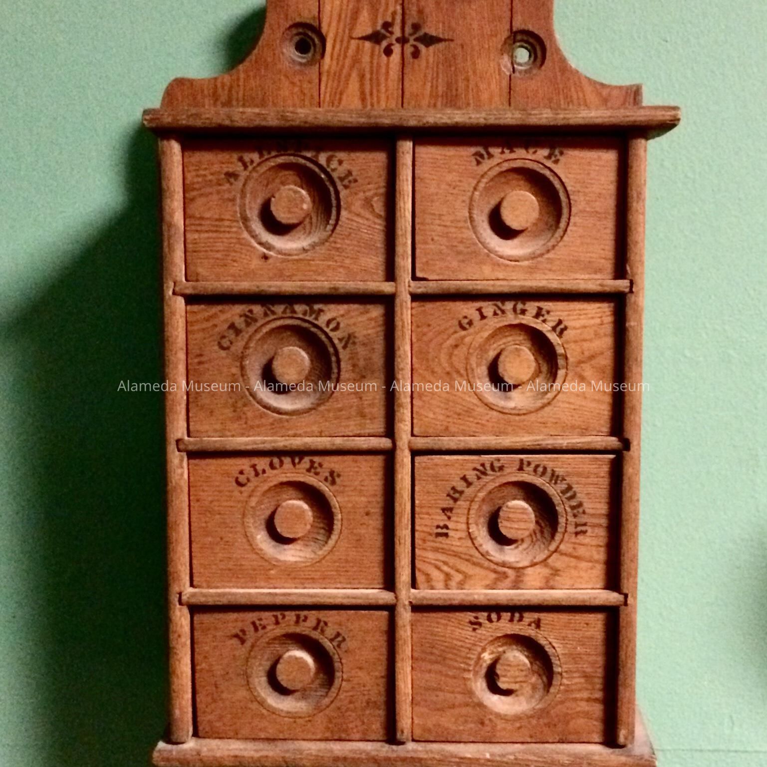 History of Object: A spice cabinet that hung in the kitchen of Mr. and Mrs. Frank Philipps of 2045 Santa Clara Ave., now demolished.