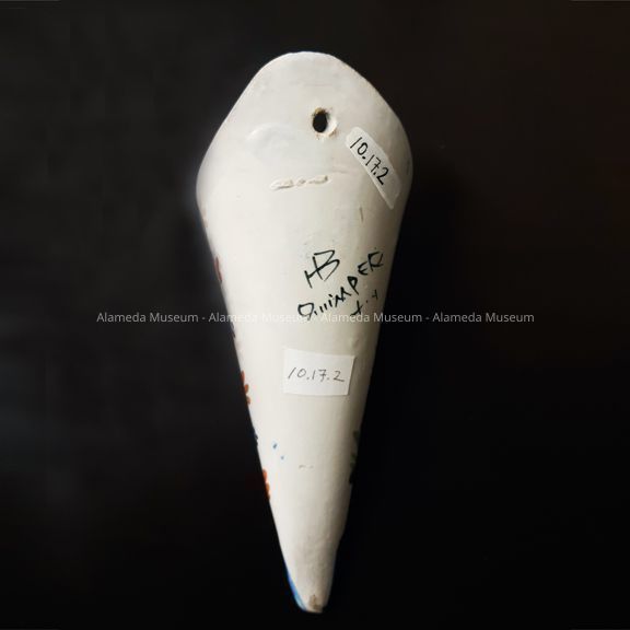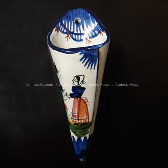A HANGING WALL POCKET IN A CYLINDRICAL FORM OF TIN GLAZED EARTHENWARE. THE PIECE IS HAND PAINTED, WITH THE CENTRAL MOTIF OF A WOMAN WEARING A PEASANT COSTUME. DOMINANT COLOR IS COBALT BLUE. ITEM IS SIGNED, "QUIMPER," (BYHAND) UNDER GLAZE.