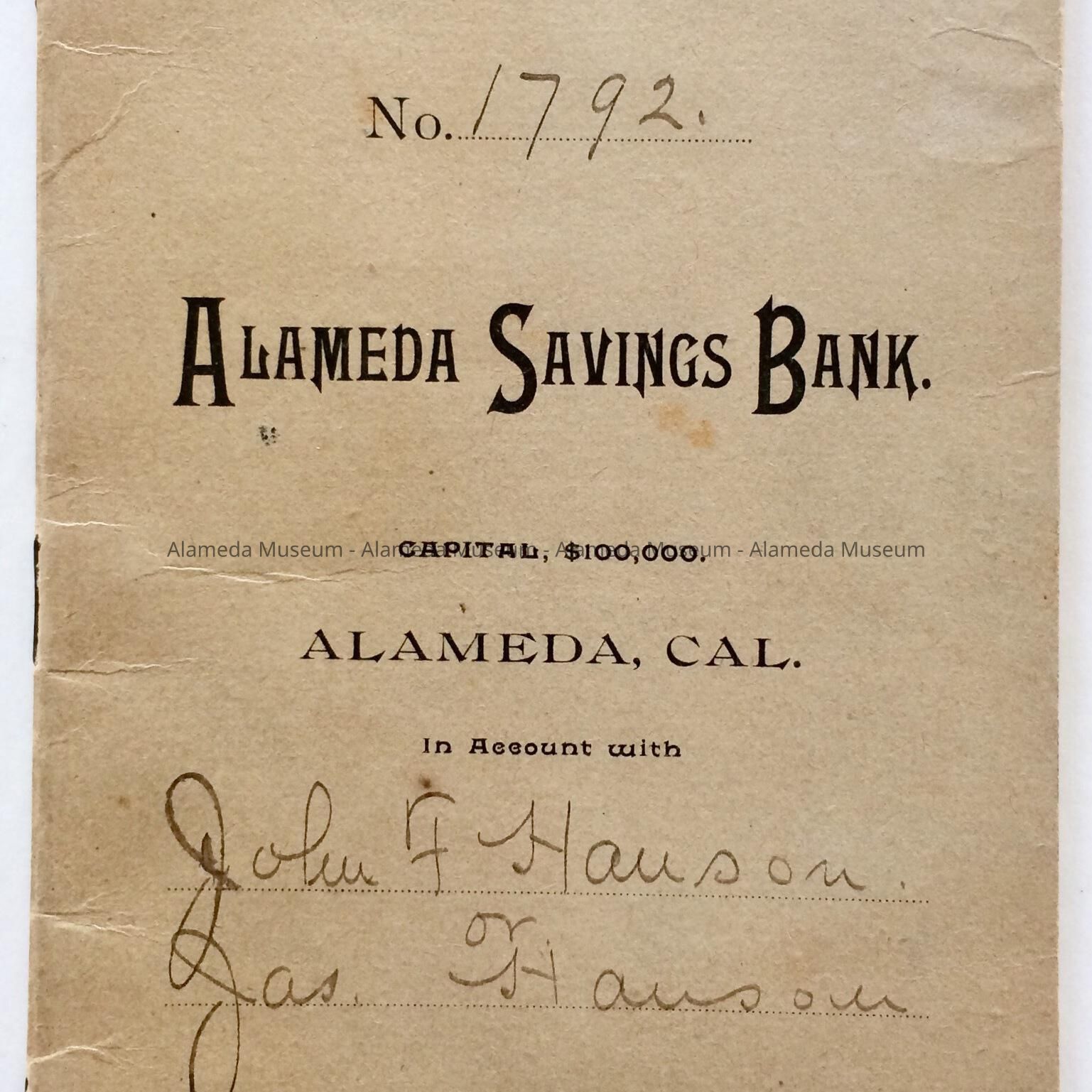 Description: Soft cover book (saddle stitch) with bold printed heading in black type "Alameda Savings Bank", and inscribed in script (sepia colored ink) John F. Hanson, Jas. Hanson.