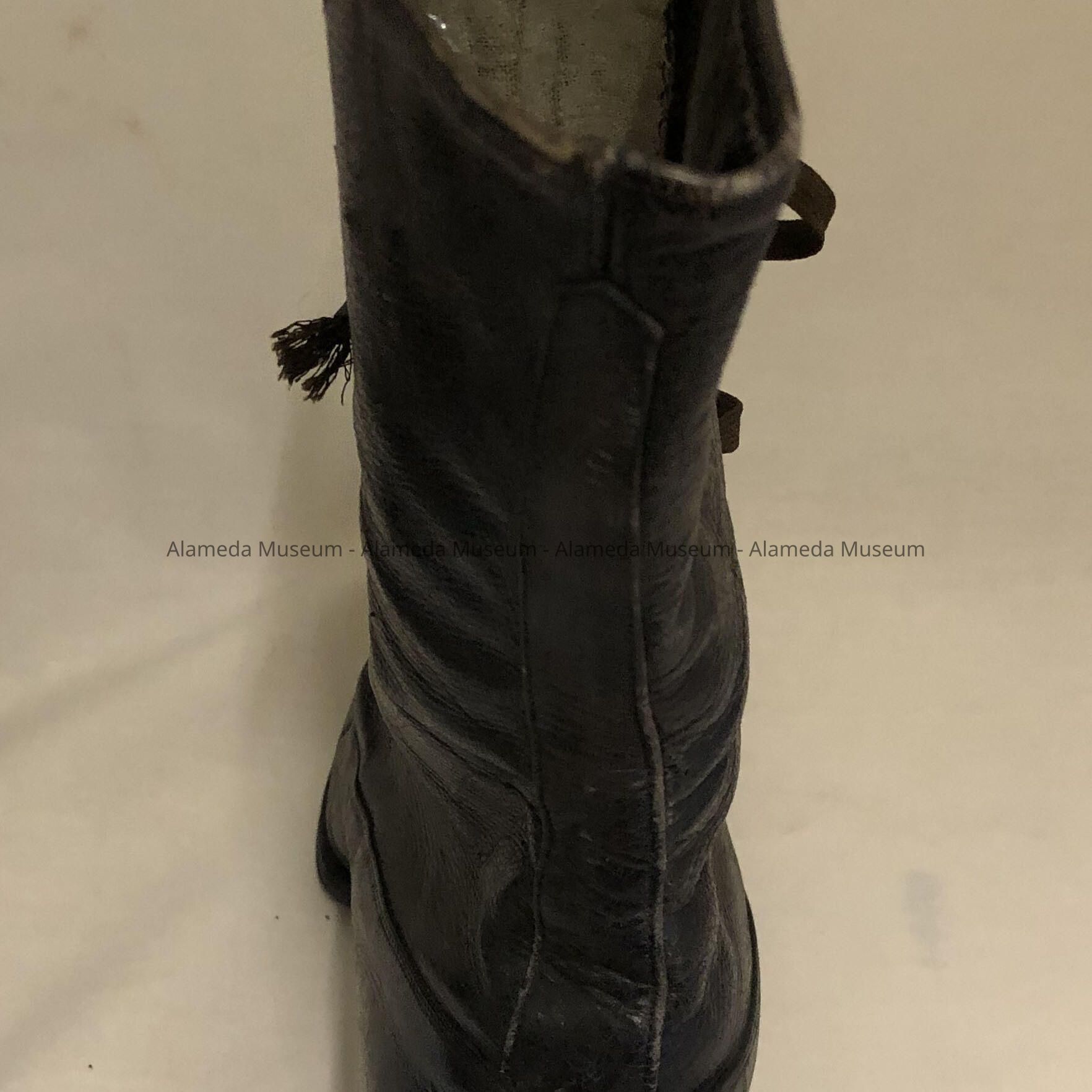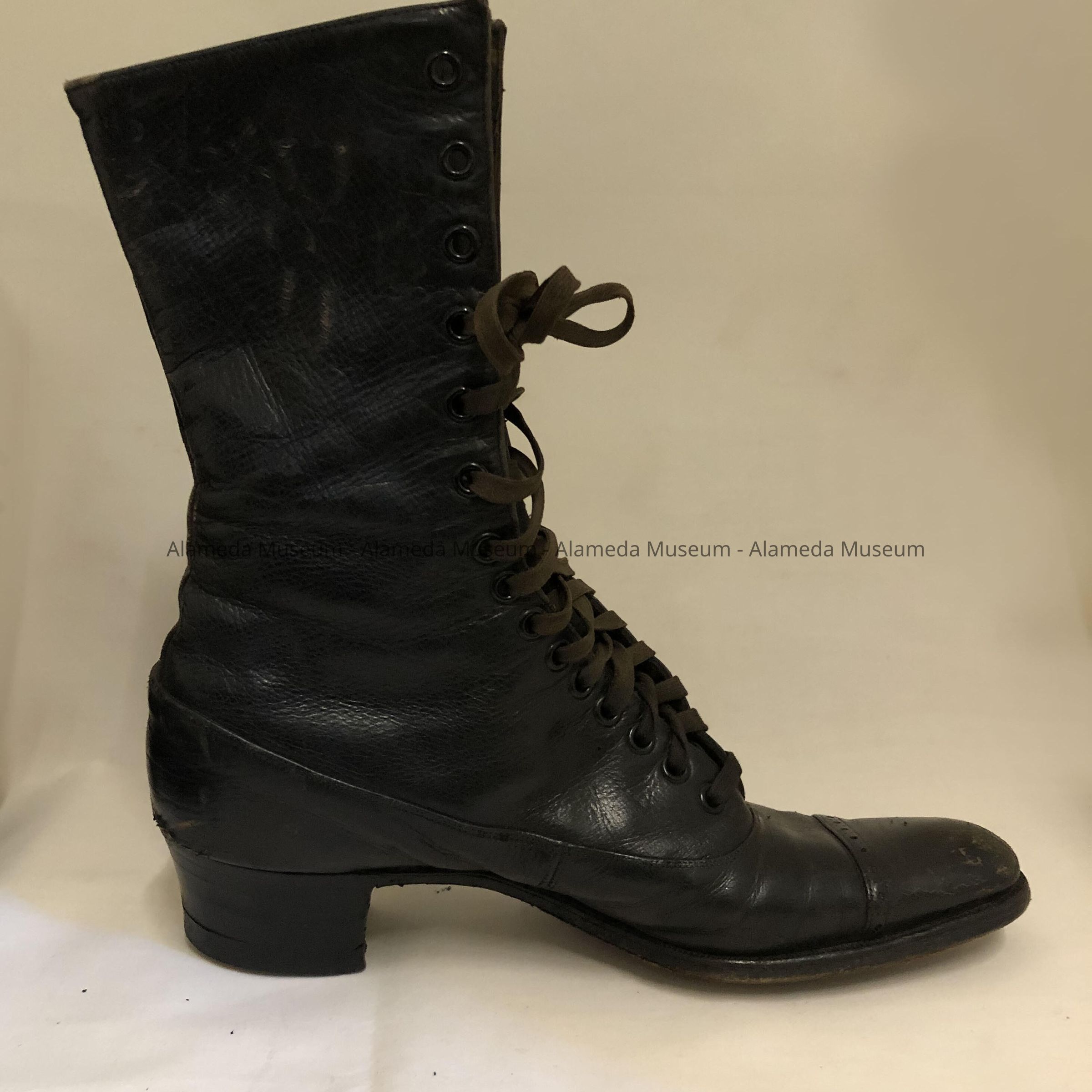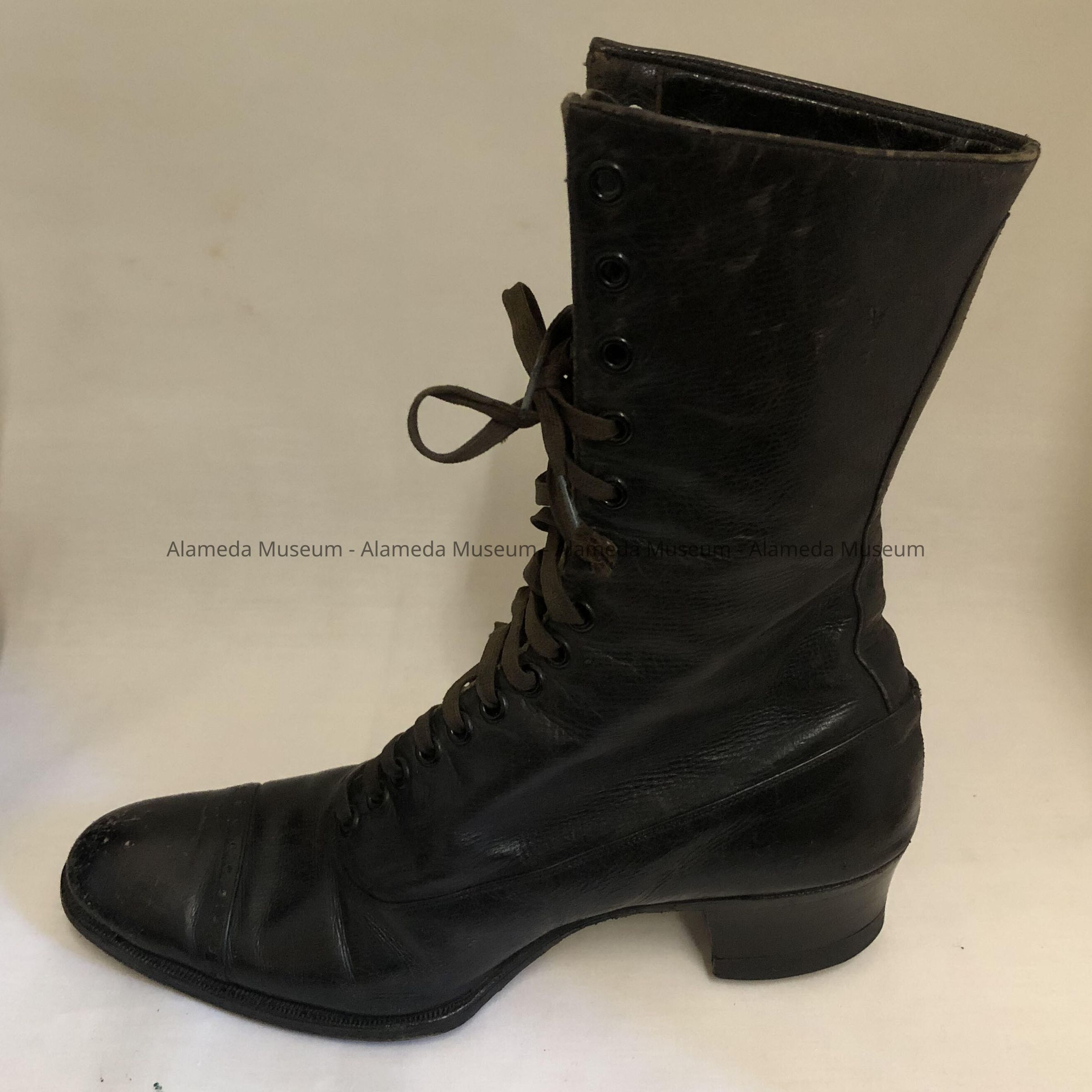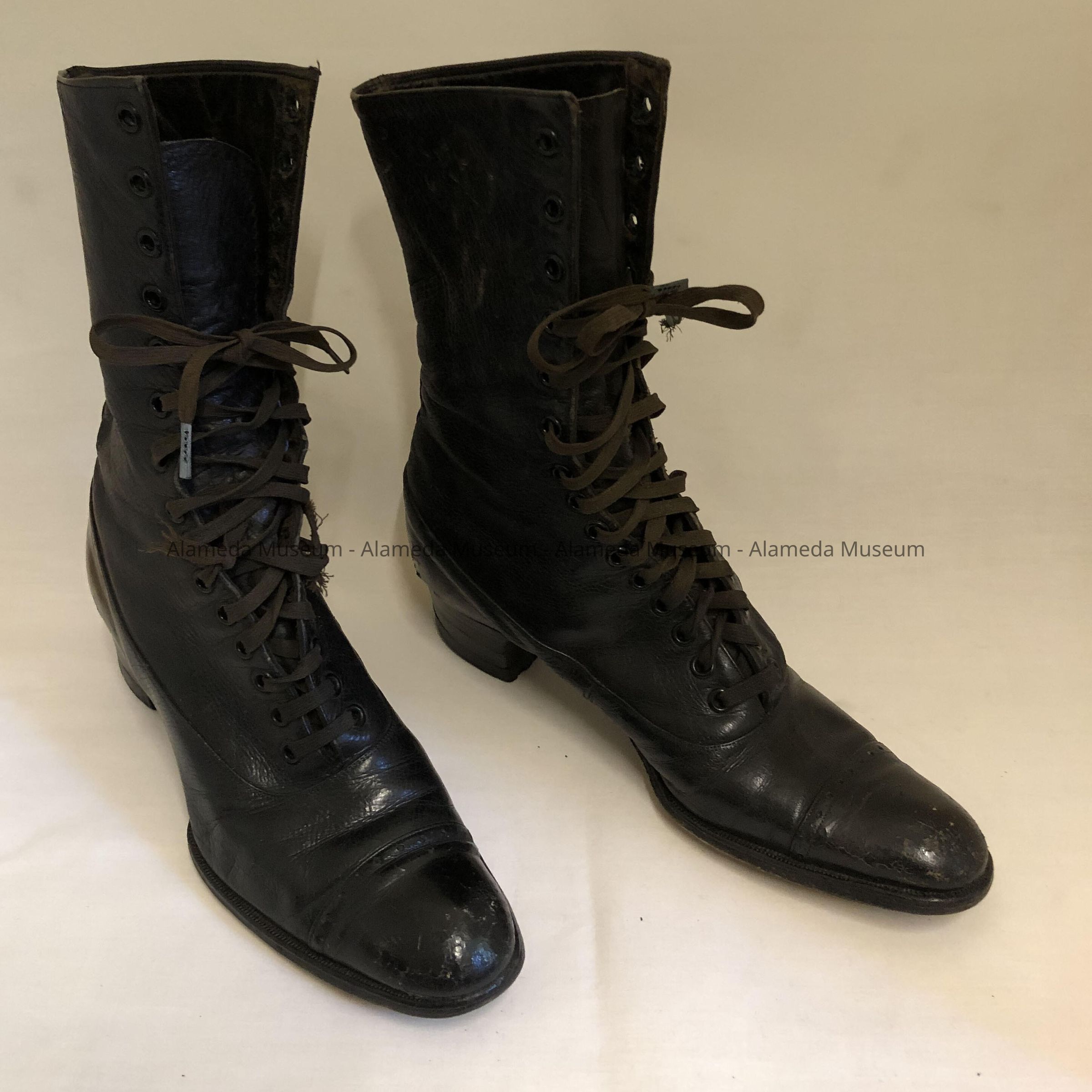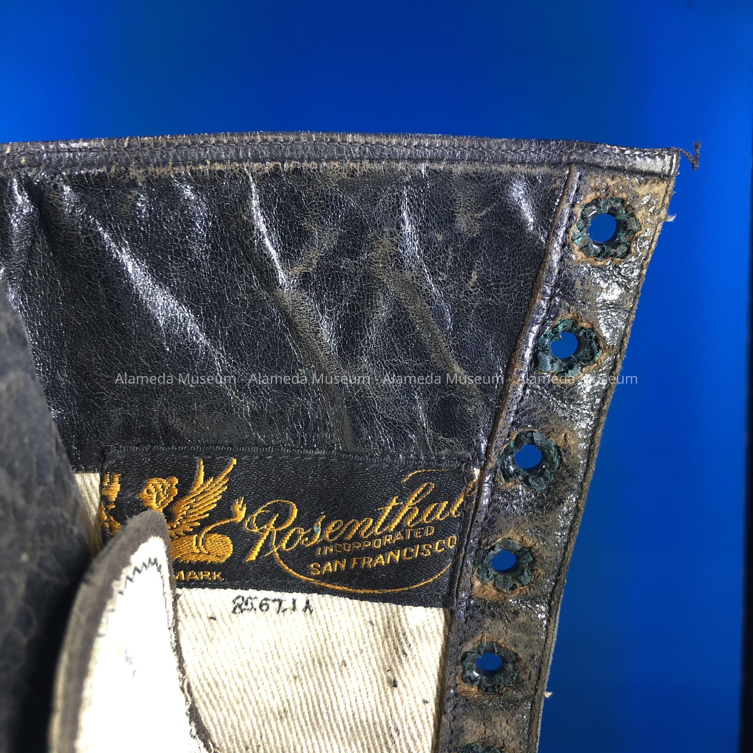 Description: Black leather high topped (lace) shoes. The right shoe has its original silk label inscribed "Rosenthal, Incorporated, San Francisco."