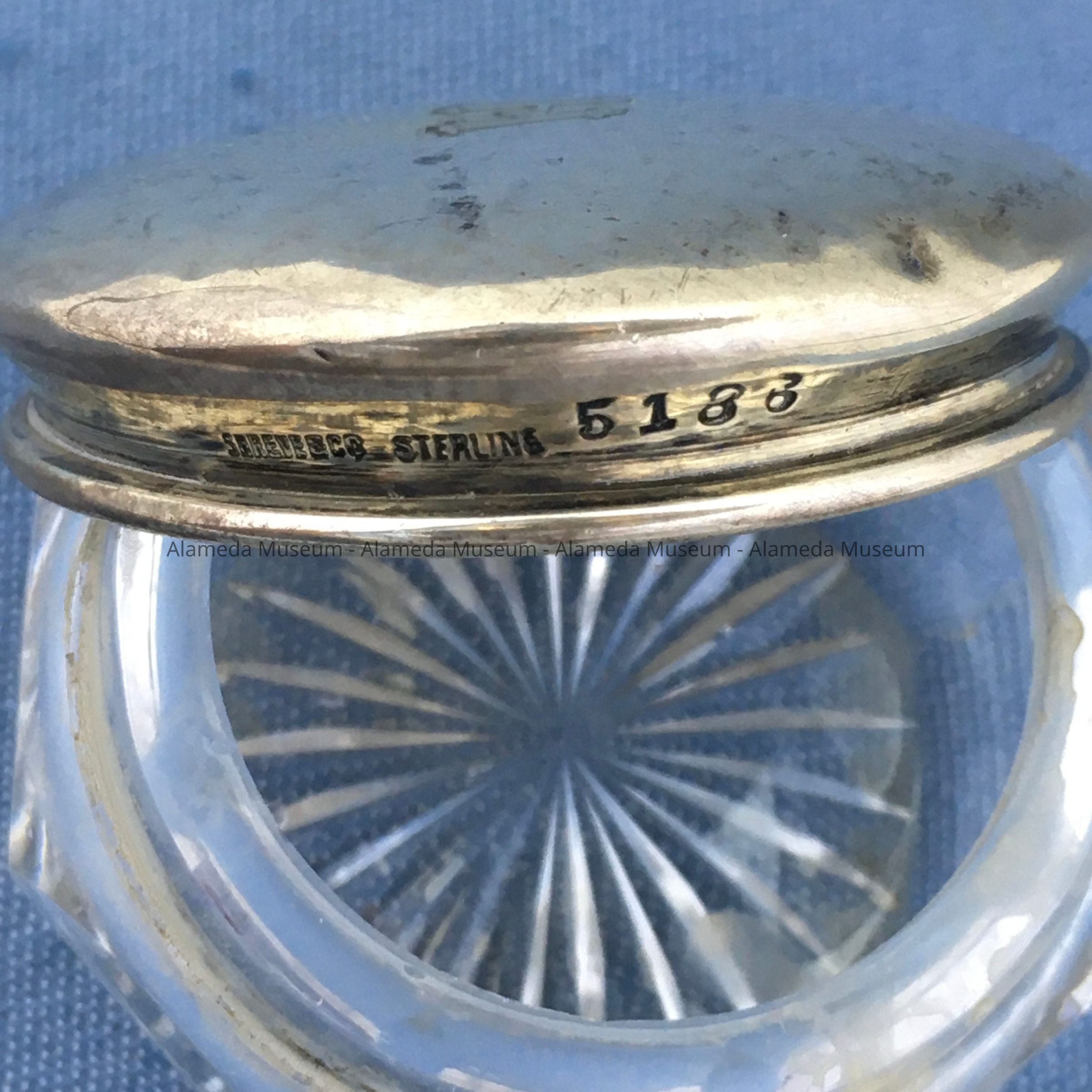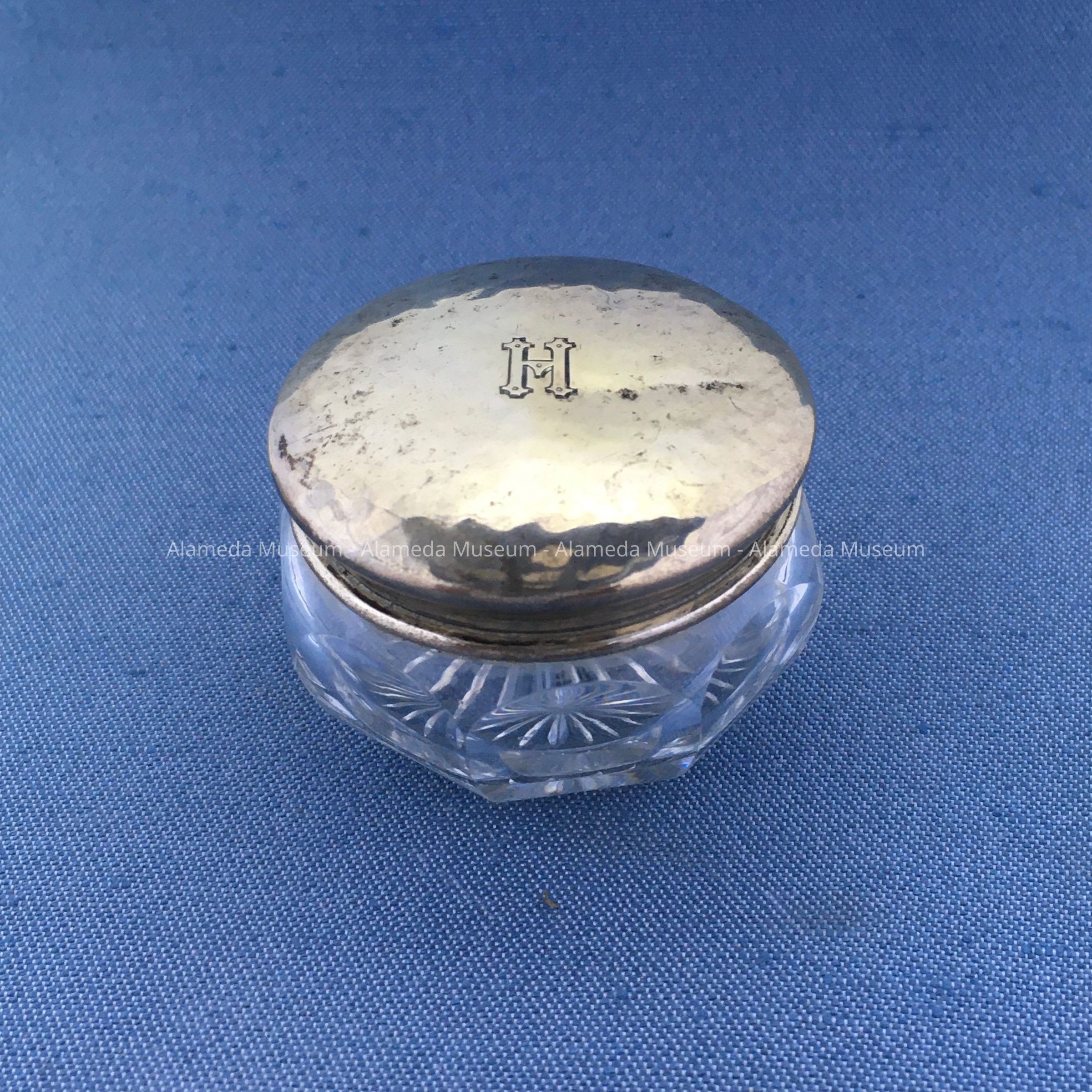 History of Object: Sterling silver covered crystal glass pin box from the dressing table of Harriet Holmes Haslett, wife of Samuel M., old time residents of Alameda.
