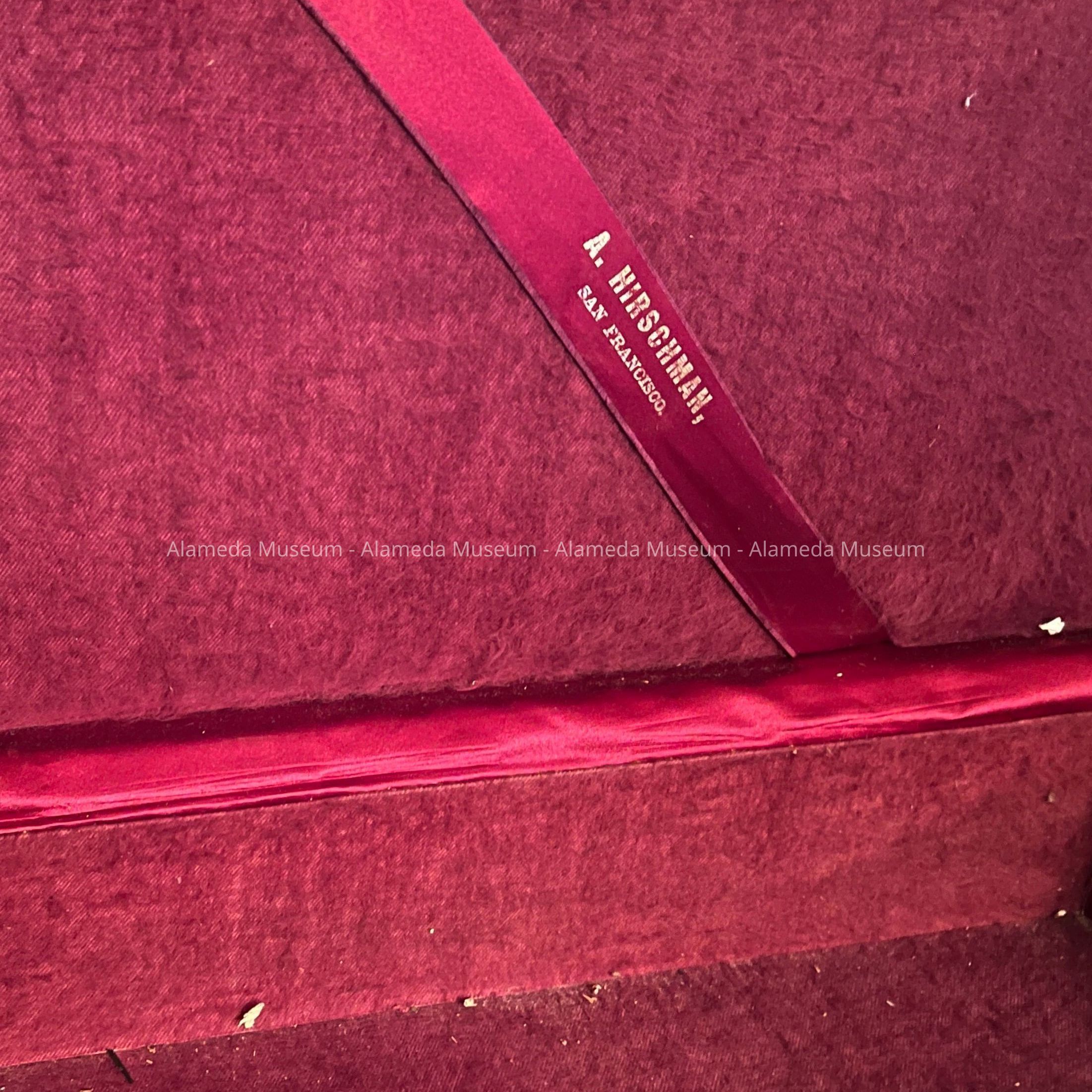 Imitation leather (brown) covered box with incised lettering in gold "Haslett" on the lid. Rose colored felt in the interior.