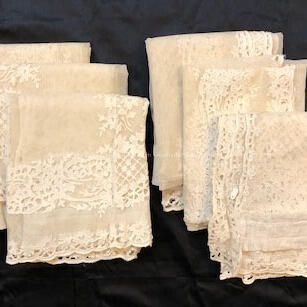Description: Six identical off-white lace curtain panels. Tulle net background with machine made Brussels muslin applique in a floral pattern along the borders.