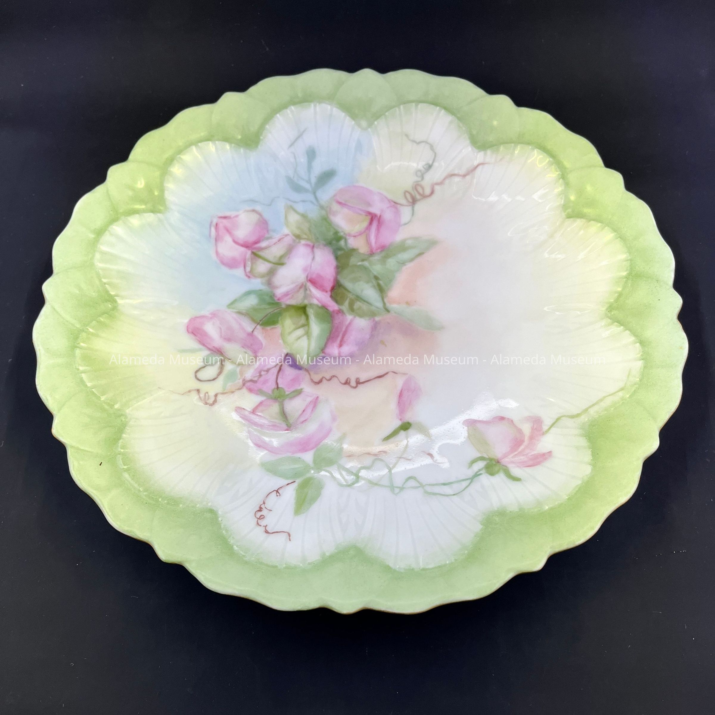 Haviland plate with pink flowers on green background, c. 1890sEntry/Object ID