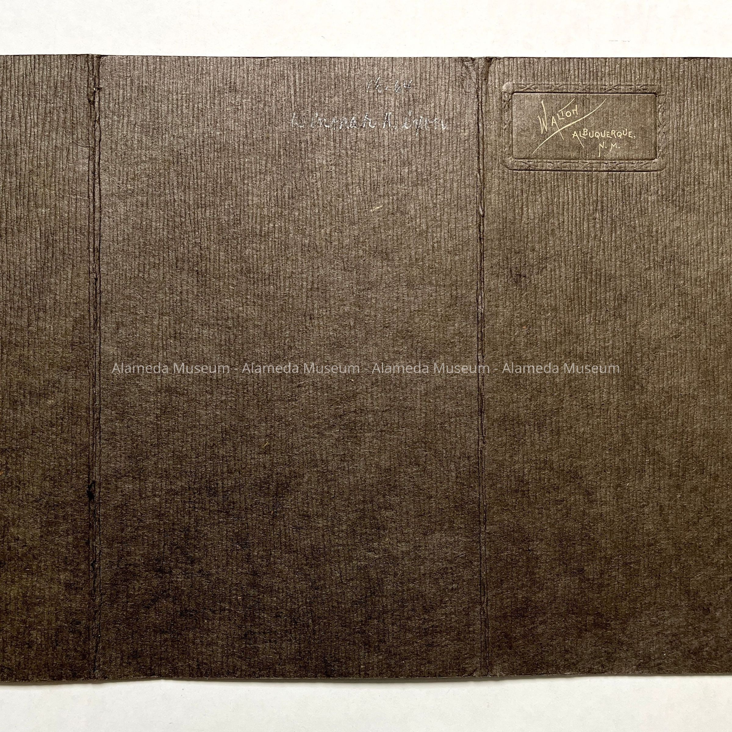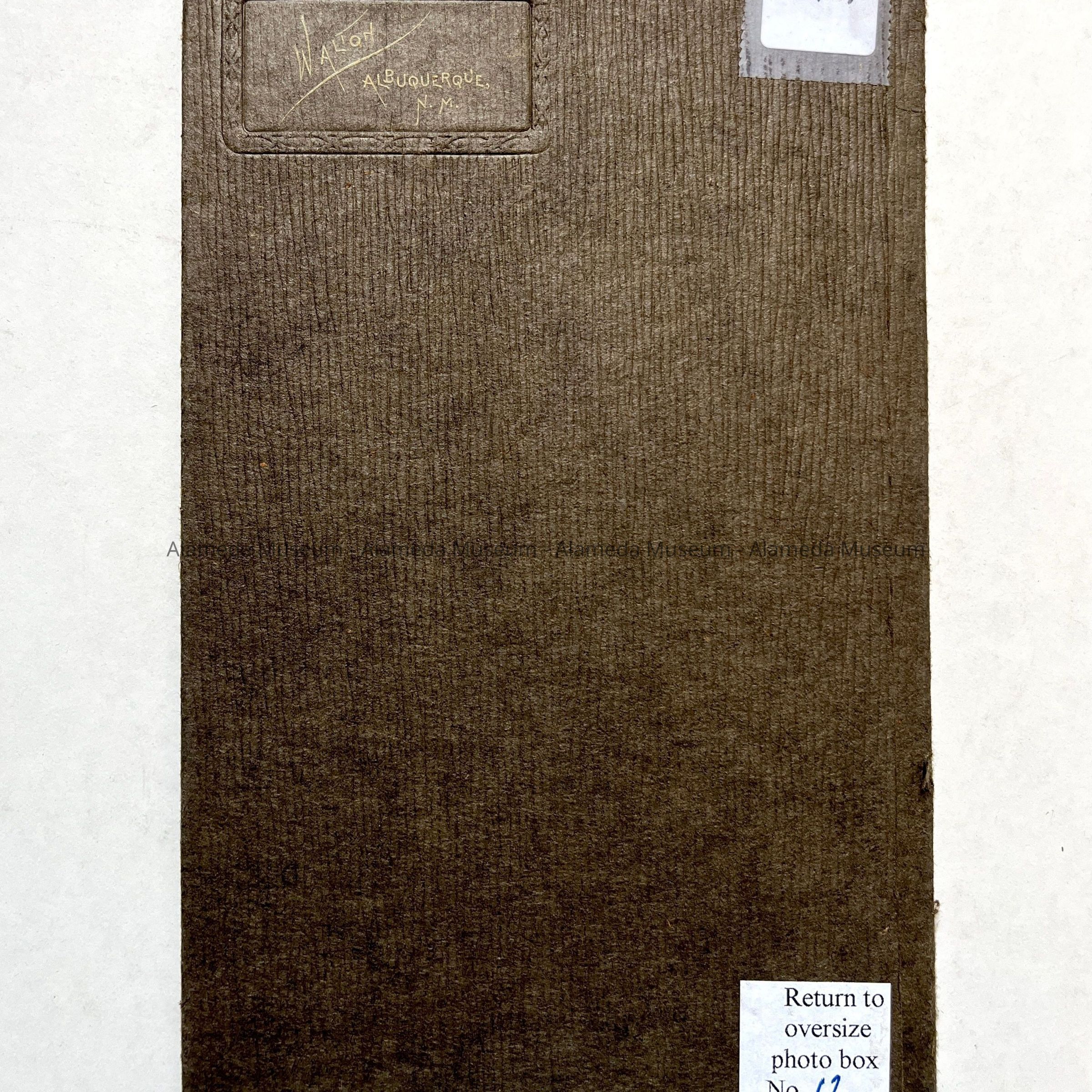 Description: a sepia-toned head and shoulders portrait of Wenonah Dixon enclosed with a gray studio folder. The photographer's name appears on the front of the folder, "Walton, Albuquerque".