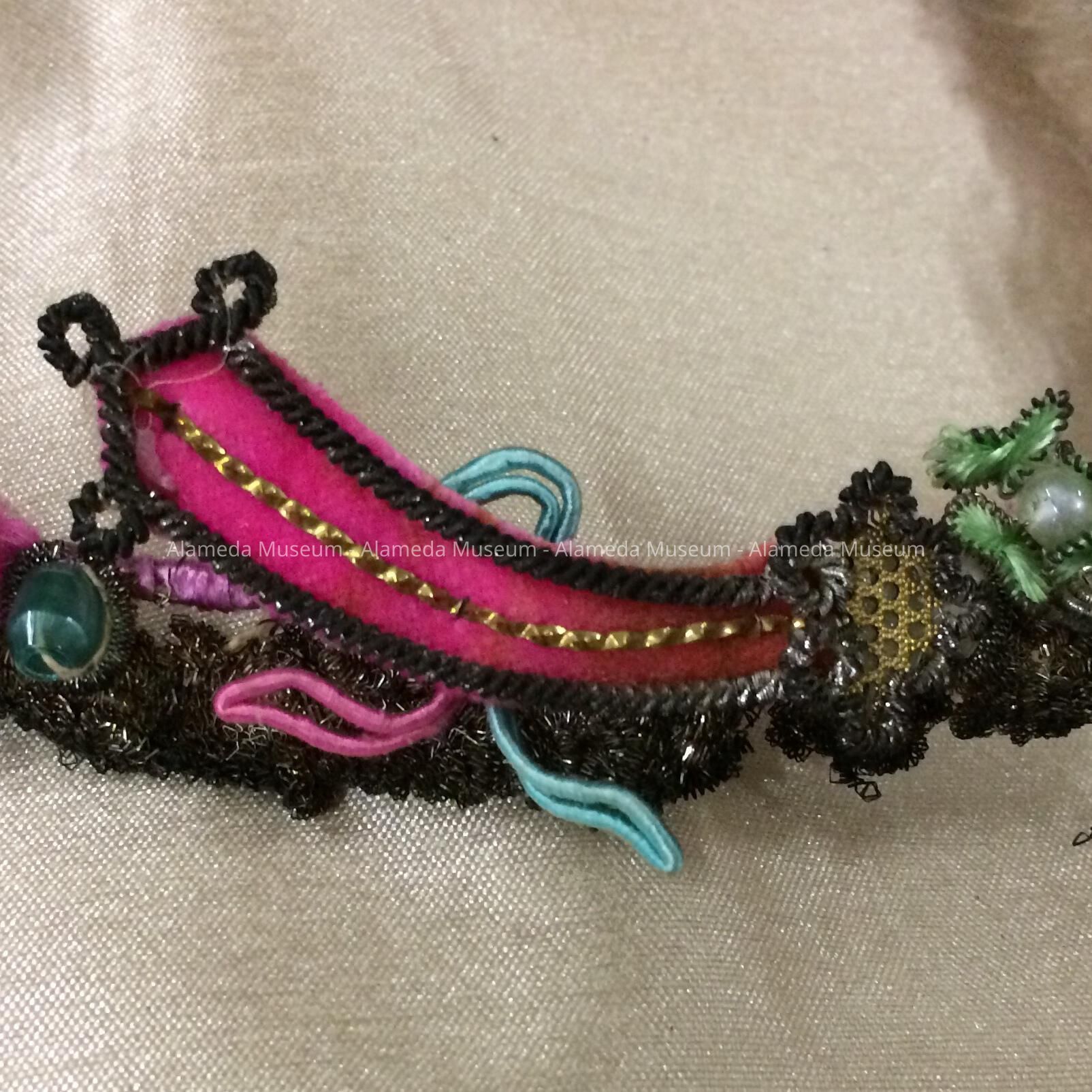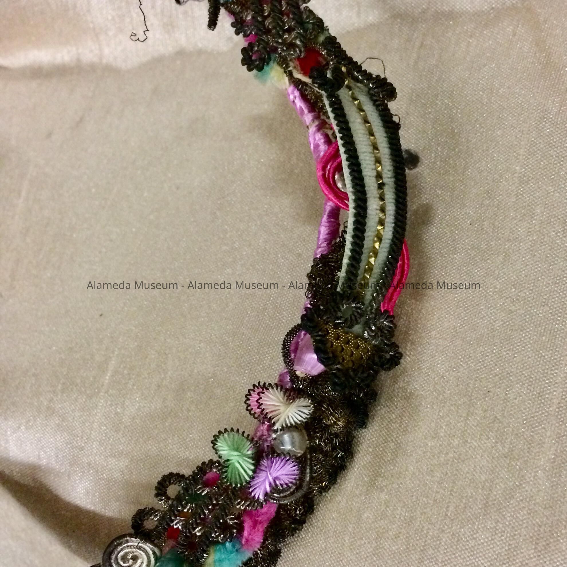 Description: Headband of silk covered beads and flowers on a silk covered metal frame, accentuated with silver thread. Chinese head ornament.