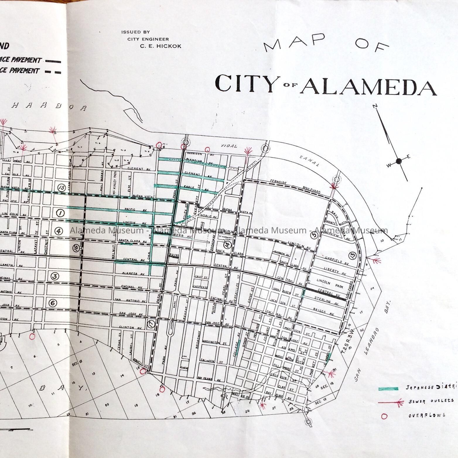 History of Object: Folder found in the attic of City Hall in the 1990s. Report created based on 1917 data, by the newly hired ‘Health Visitor’ Zdenka Buben. Report includes health and sanitary statistics including death by disease, infant mortality, etc. Some statistics give data per race. Includes 2 photos of a dairy. Includes 4 maps which plot statistics, one of which gives a general idea of where Japanese lived in Alameda. Also includes a blueprint style organizational chart.