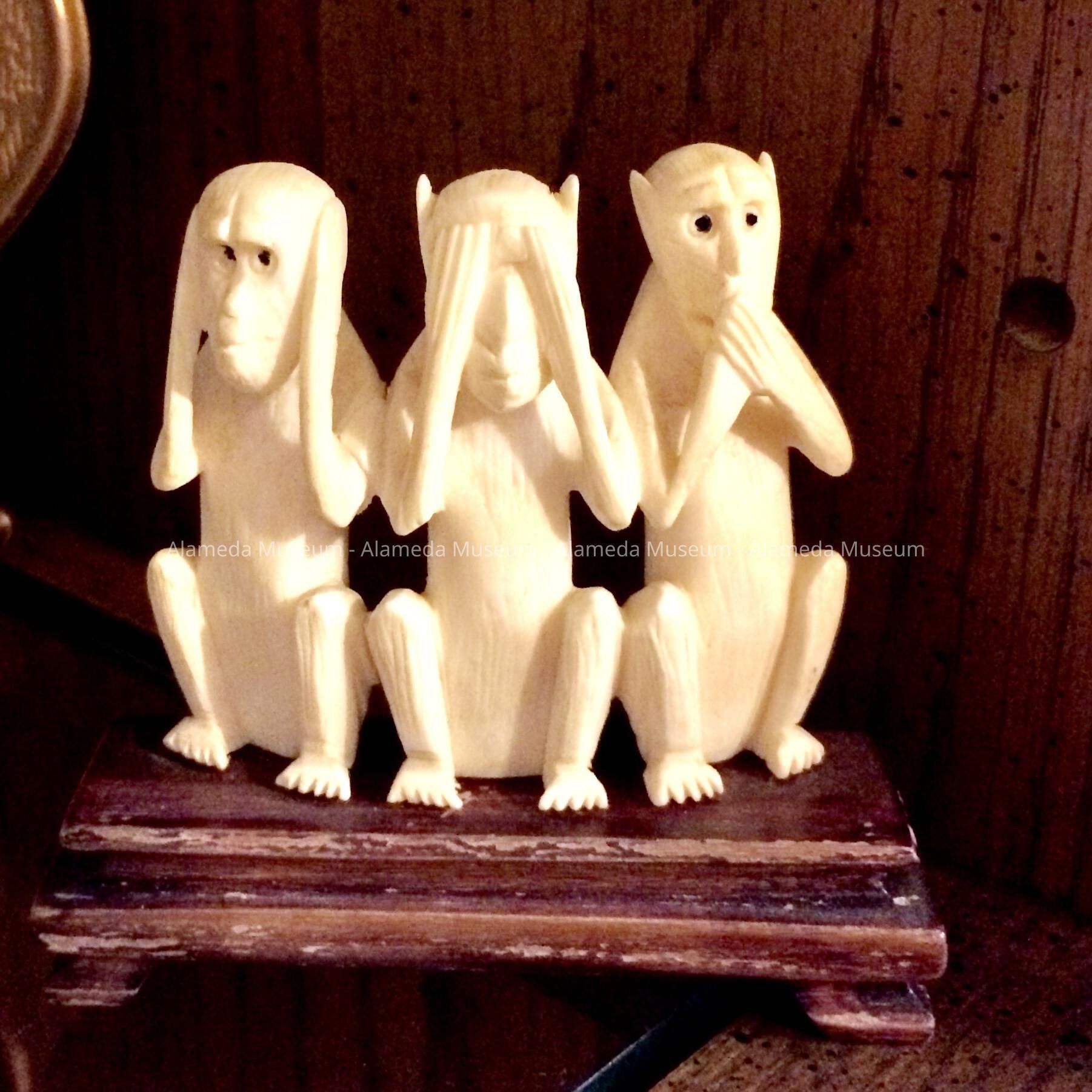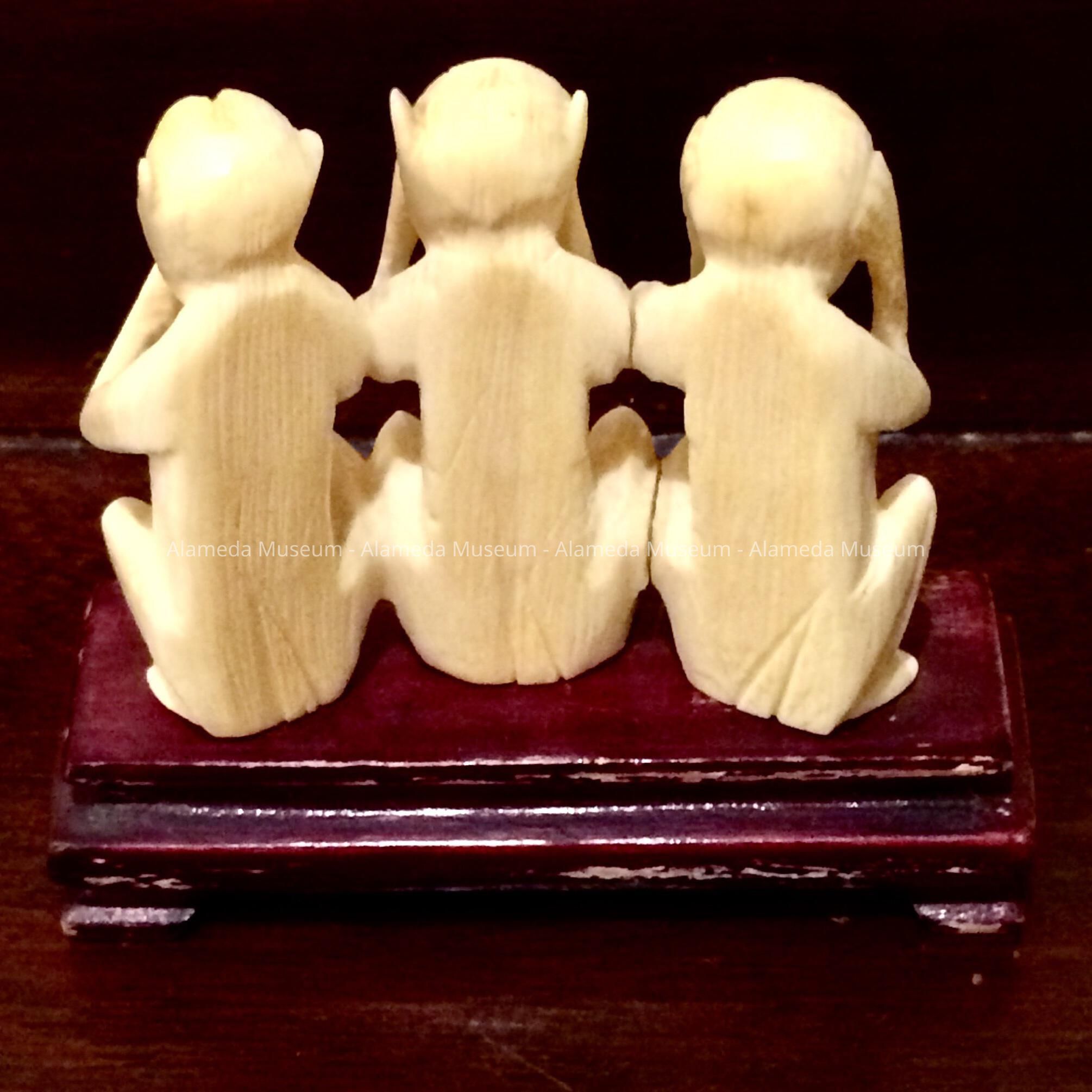 Description: Carved bone figurine consisting of three monkeys in the pose, "Hear, See and Speak No Evil", on carved wooden pedestal or mounting.
