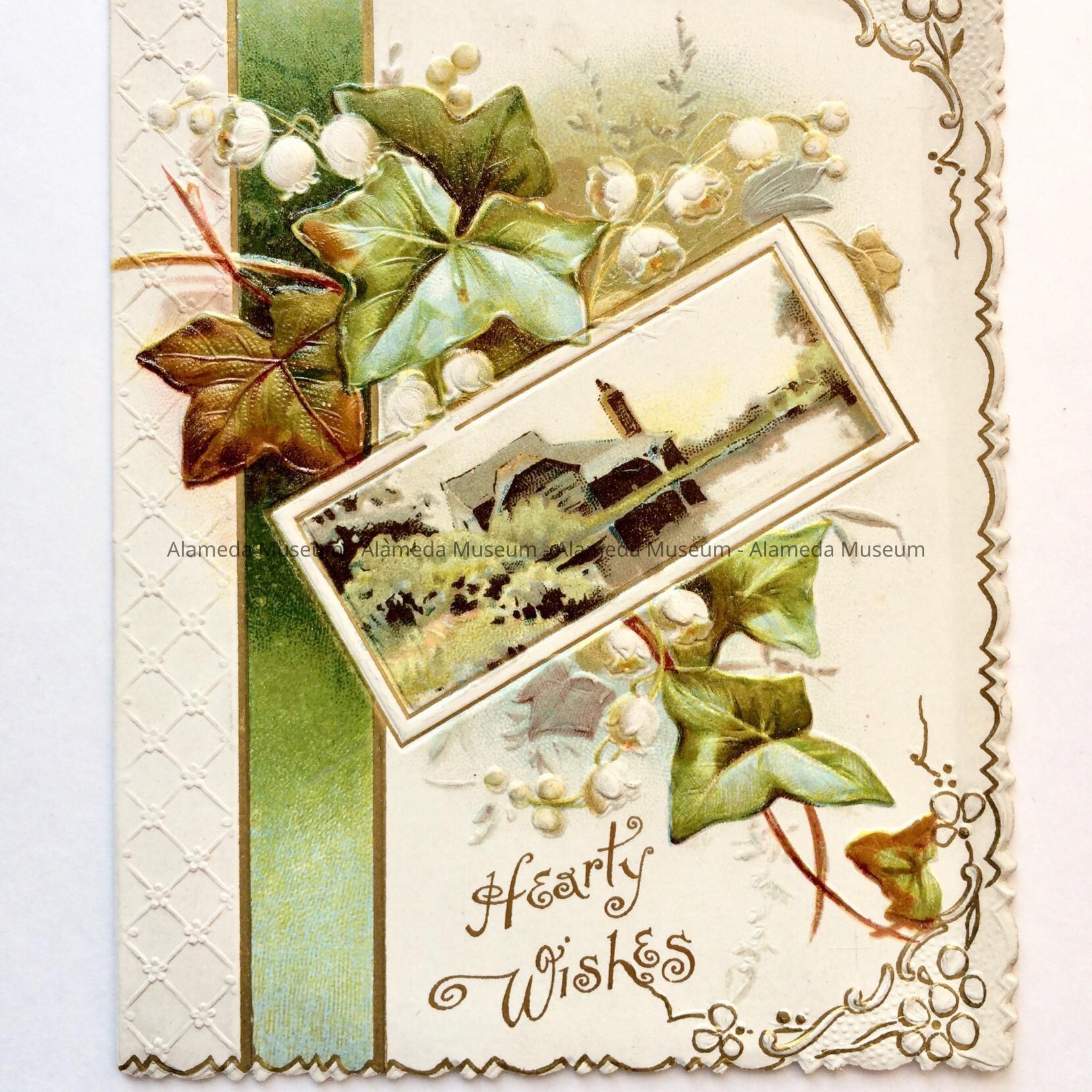 Description: Embossed lithograph card with caption in gold type "Hearty Wishes," illustrated with a pastoral scene entwined in ivy.