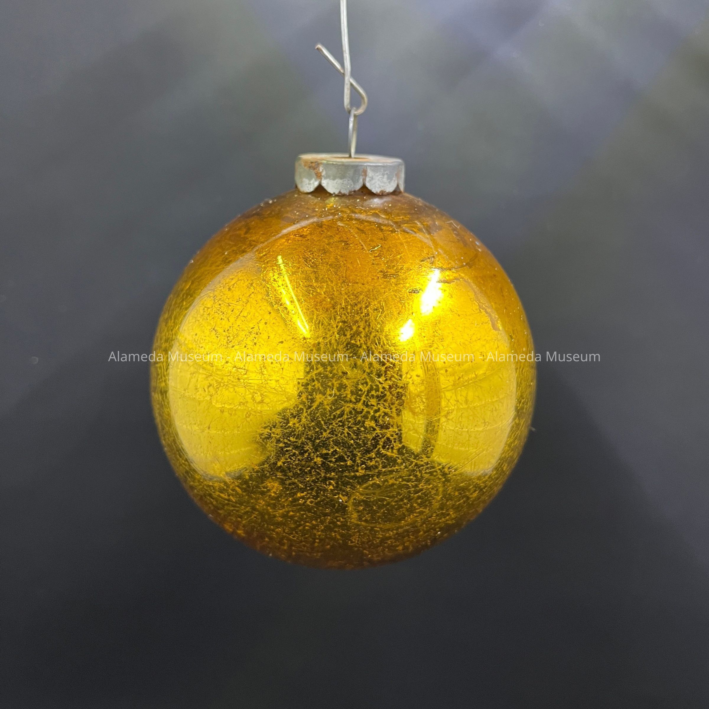 Description: A heavy glass ball ornament, painted gold. Has a cap with hook for hanging. The surface is crackled and has a large looping mark.
