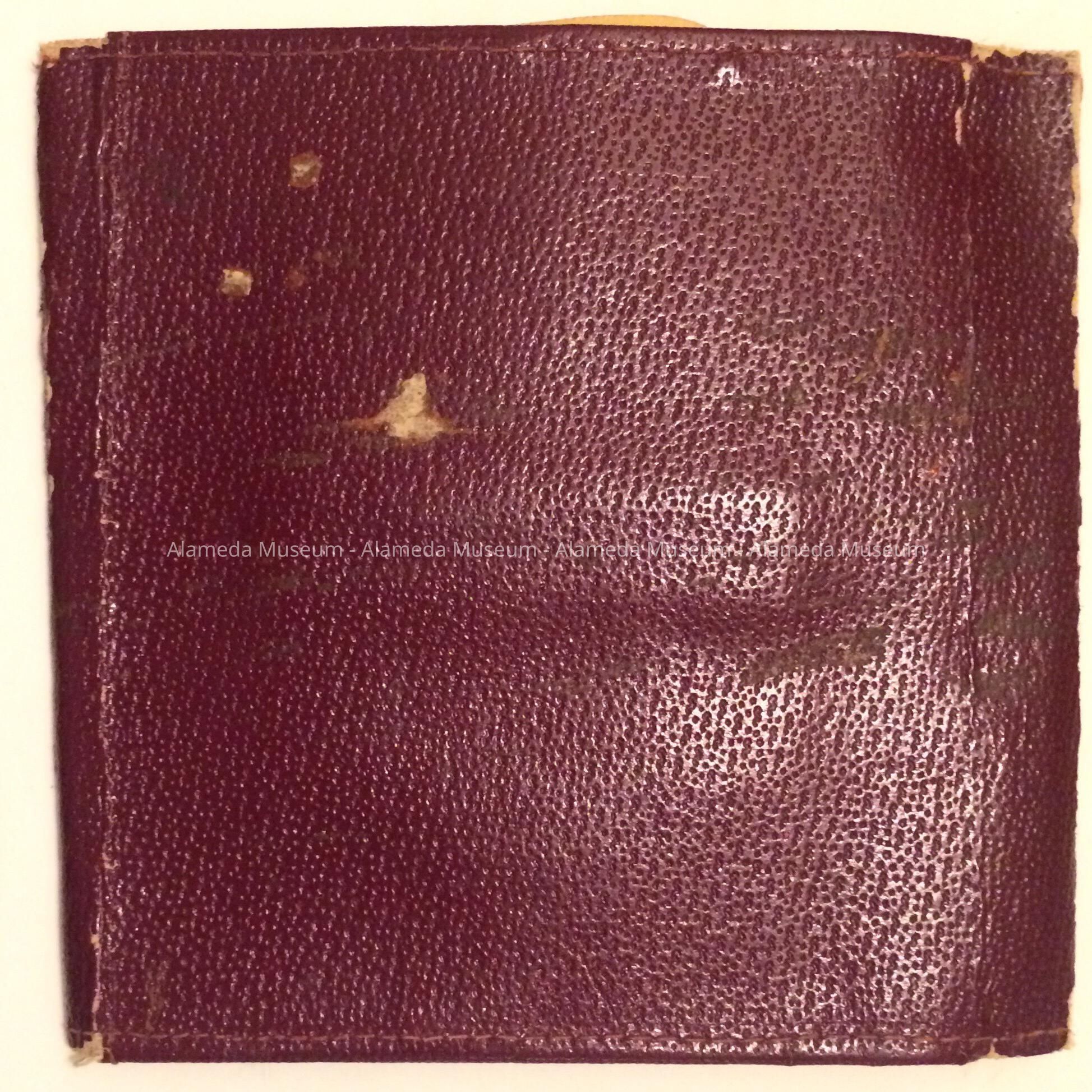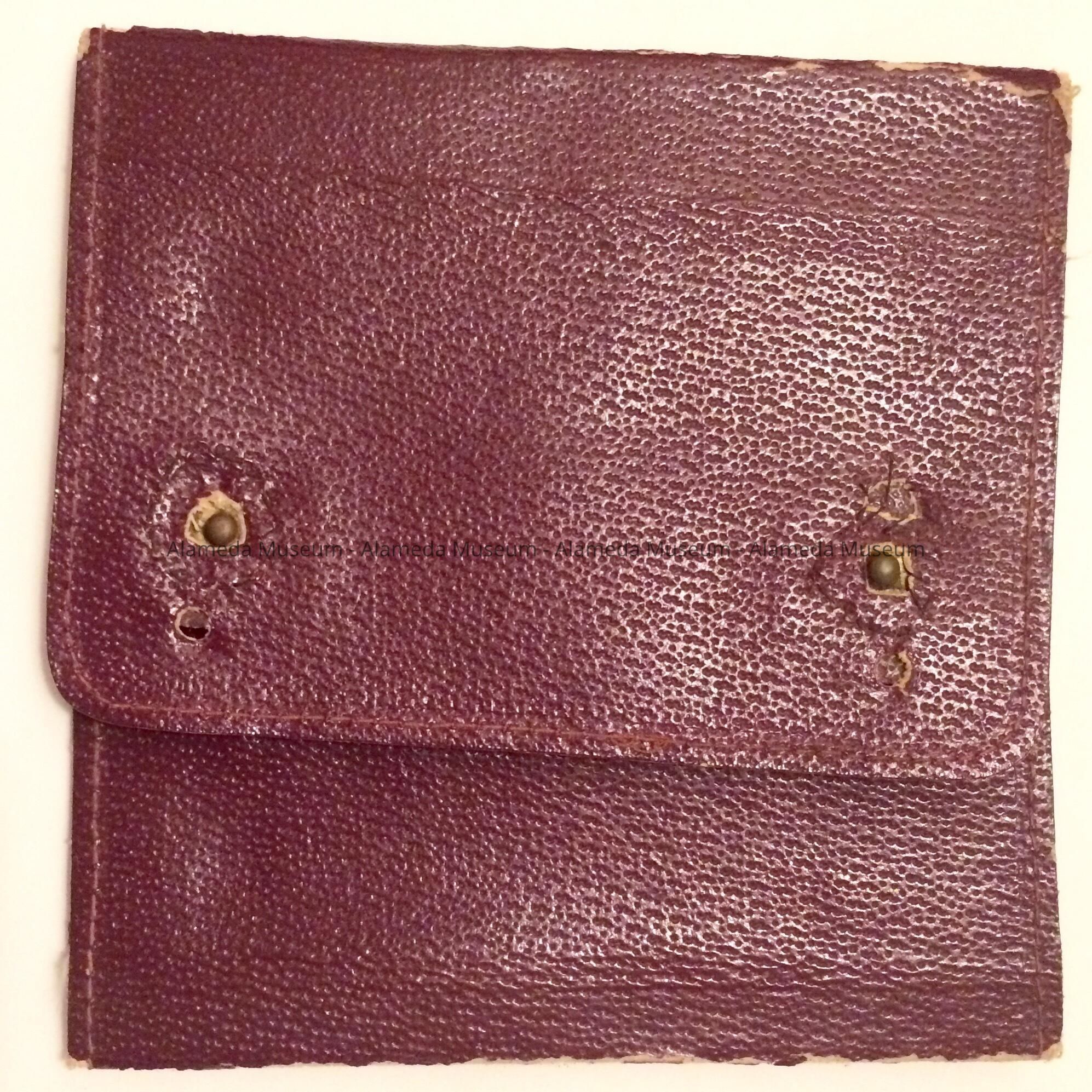 Description: Closed imitation red leather folder, interior is cream colored. It has two snaps for closing.