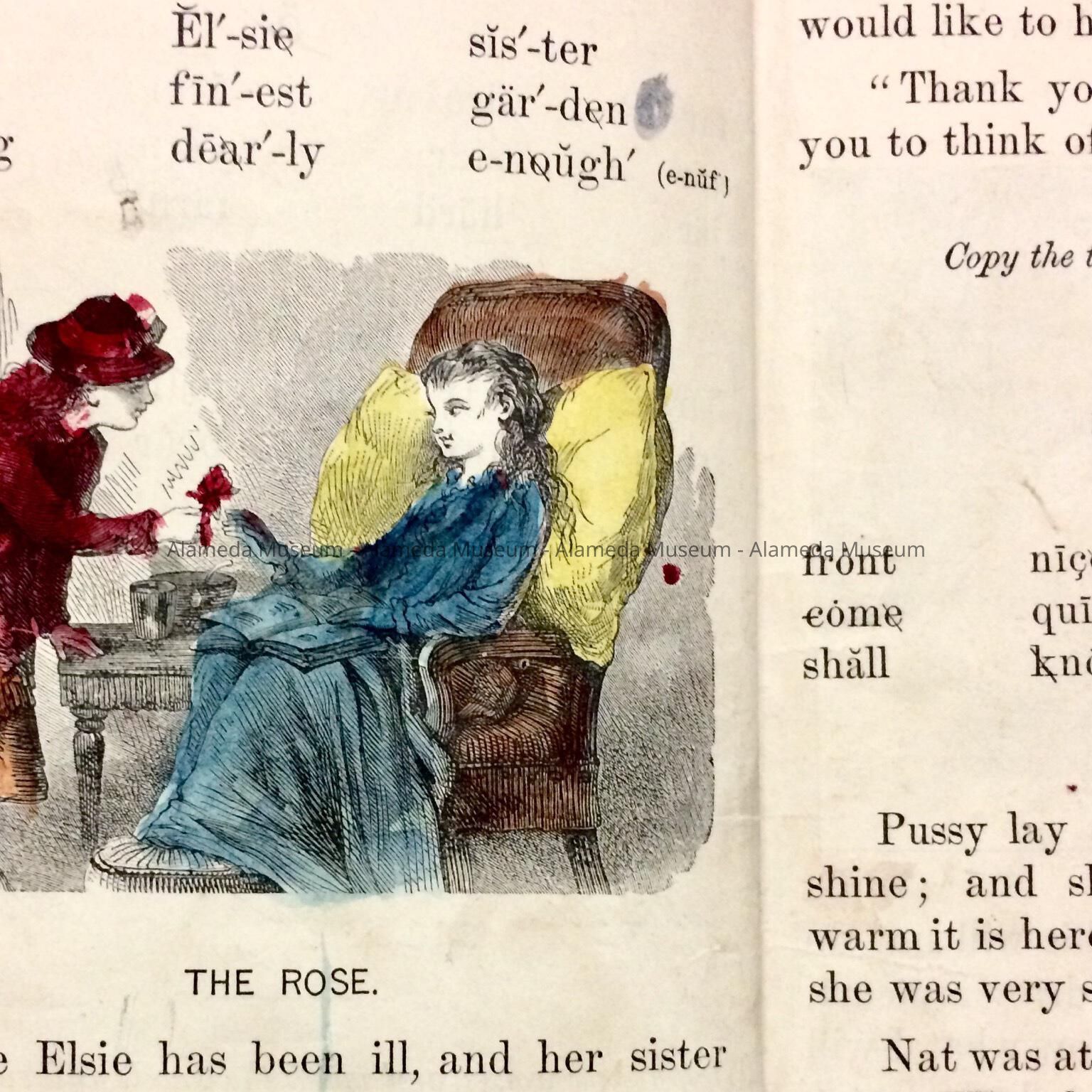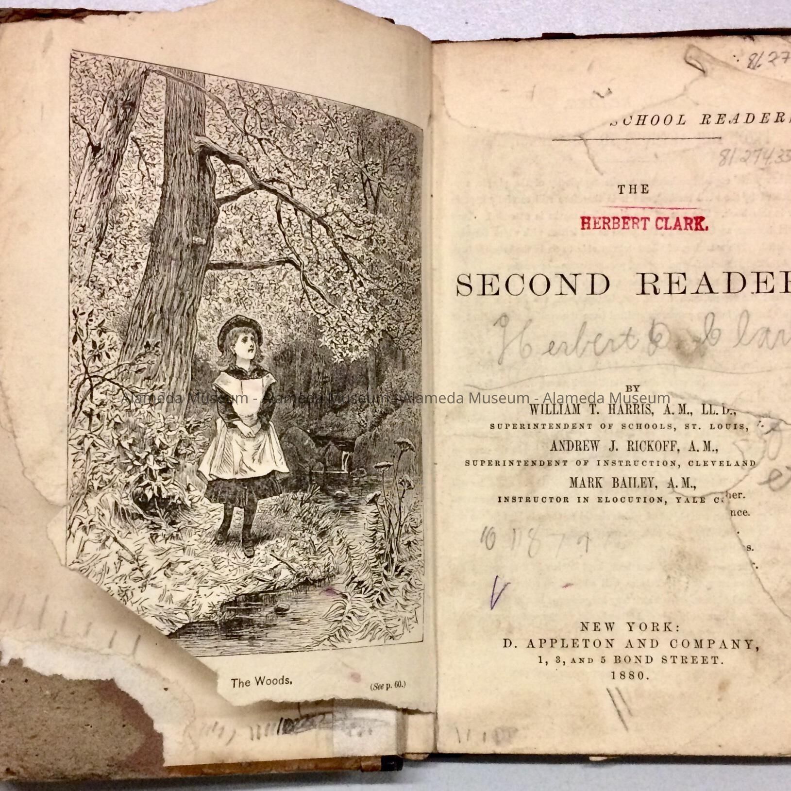 Description: Hard covered book, illustrated. 140 pages. Title "Appleton's School Readers, Second Reader" printed on cover, with an elaborate stenciled design around border. First page inscribed in purple ink "Herbert D. Clark, Alameda, 1883".
