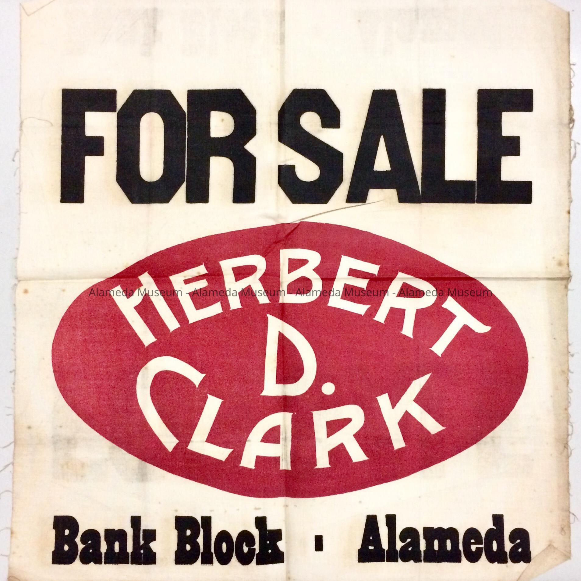 Description: Linen sign with printed inscription in red and black print. Bold heading "For Sale" In the oval red center "Herbert D. Clark". At the bottom "Bank Block, Alameda".