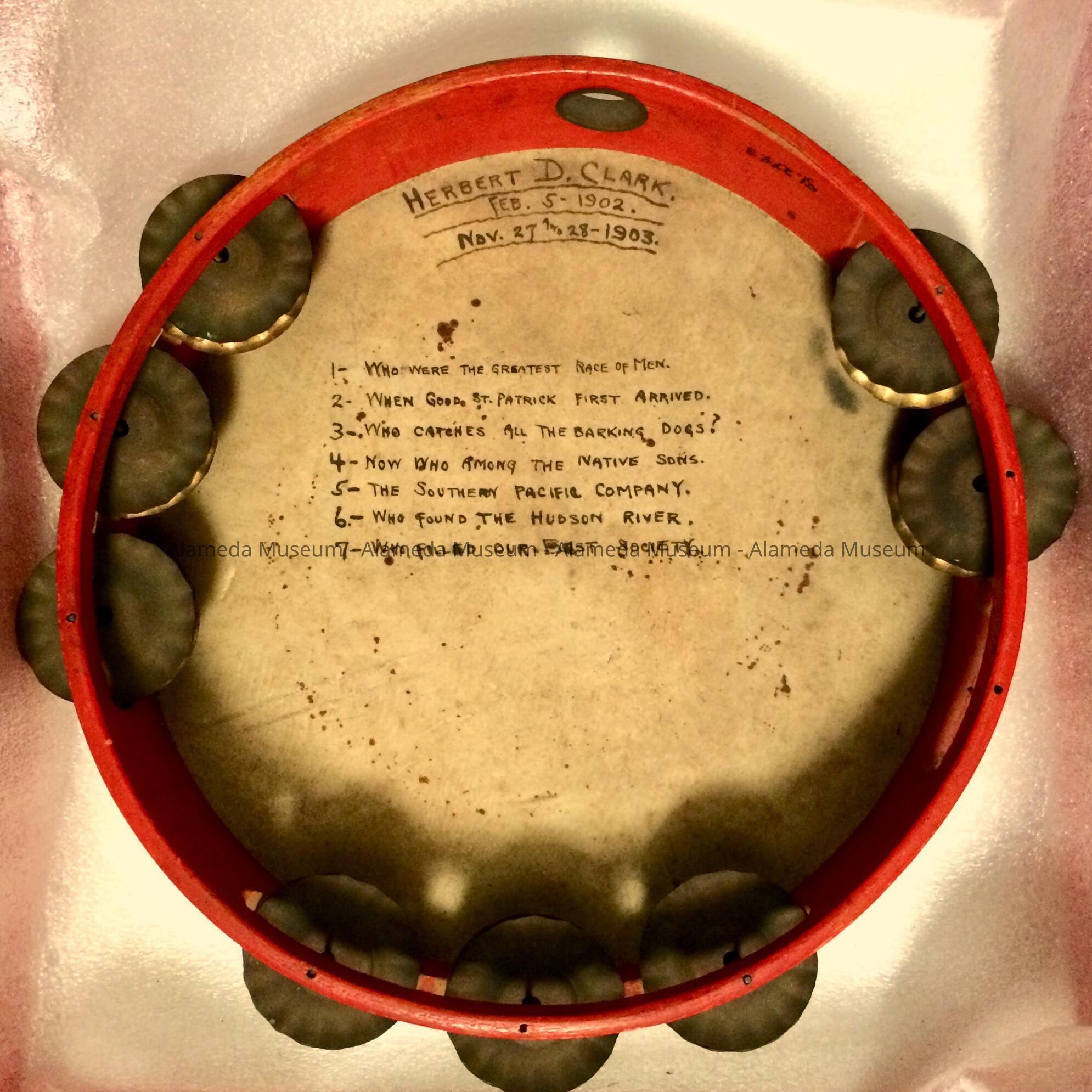 History of Object: Tambourine used by Herbert D. Clark, February 5, 1902 and again November 27-28, 1903 in local minstrel shows under auspices of the Alameda Elks Club, BPOE 1015. The one to seven written sentences were memory joggers" for lines used by the players.