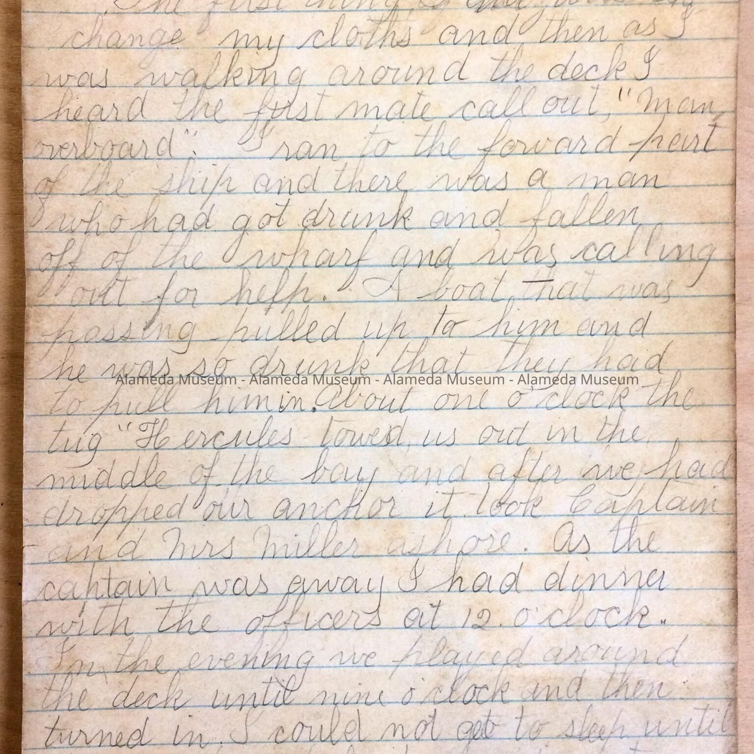 History of Object: The diary kept by Herbert D. Clark, May 25, to August 5th, 1888, when he was sent to sea at the age of twelve years old. The diary is hand written and there is a reference, dated June 9, 1888 where he goes searching for specimens of seaweed. He says it is quite different from the type found in Alameda. Mr. Clark's family had settled in Alameda in 1878.
