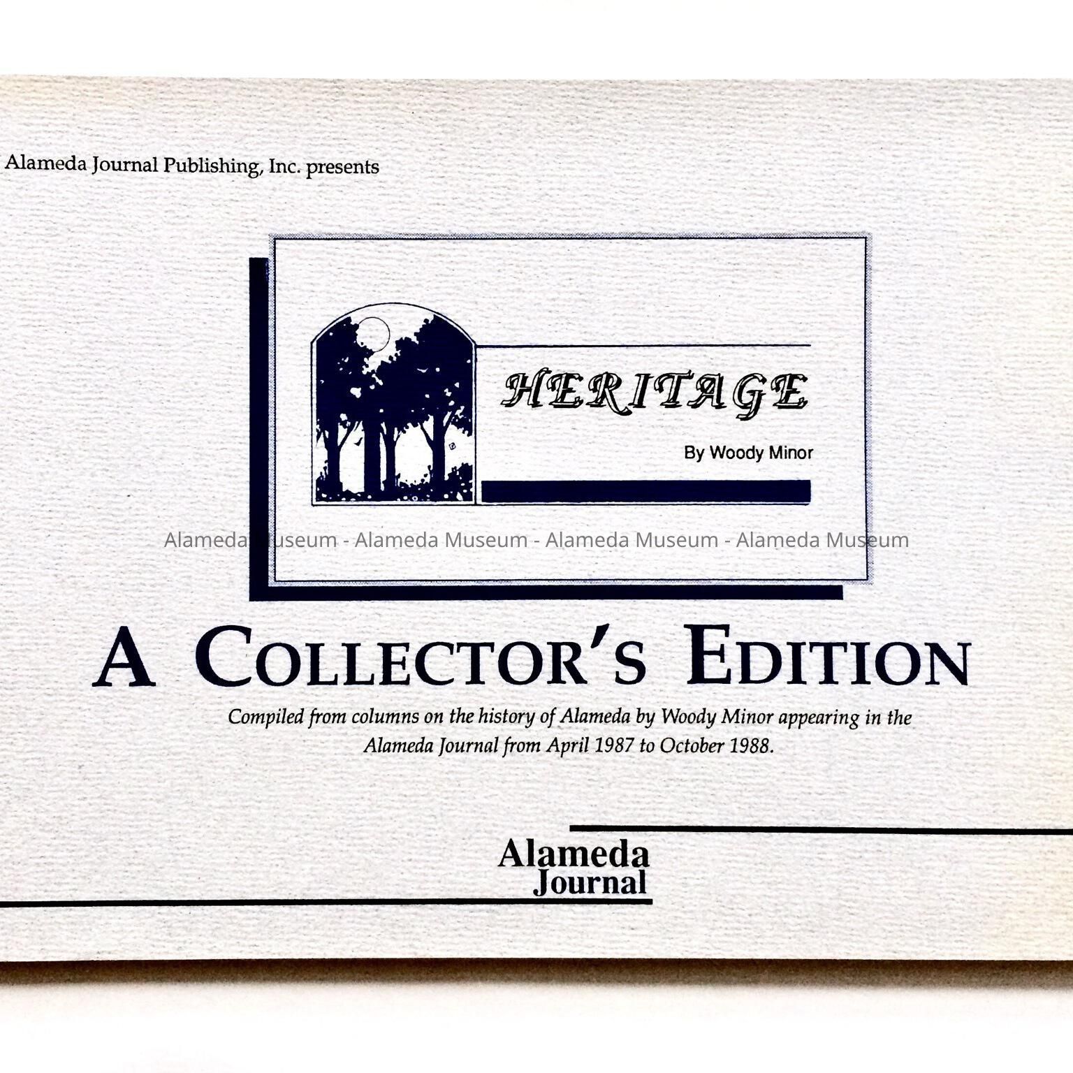 HISTORY OF OBJECT: A BOOKLET TITLED, "HERITAGE," BY WOODY MINOR AND ISSUED BY THE ALAMEDA JOURNAL NEWSPAPER. BOOKLET IS TITLED, "A COLLECTOR'S EDUCATION," COMPILED FROM COLUMNS WRITTEN BY WOODY MINOR IN THE ALAMEDA JOURNAL ON THE HISTORY OF ALAMEDA. HIS ARTICLES APPEARED IN THE ALAMEDA JOURNAL FROM APRIL 1987 TO OCTOBER 1988. SOME OF THE ARTICLES INCLUDED THE POLITICAL SCANDALS OF THE 1930's IN ALAMEDA; AN ARTICLE ON HENRY H. MEYERS, ETC.