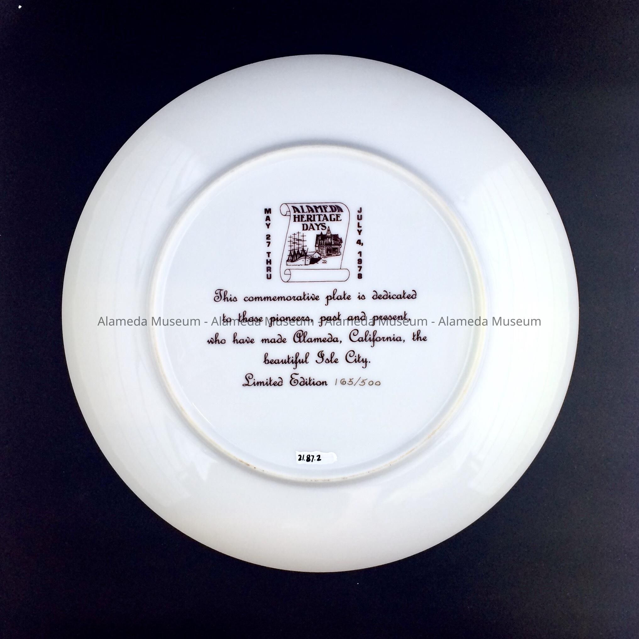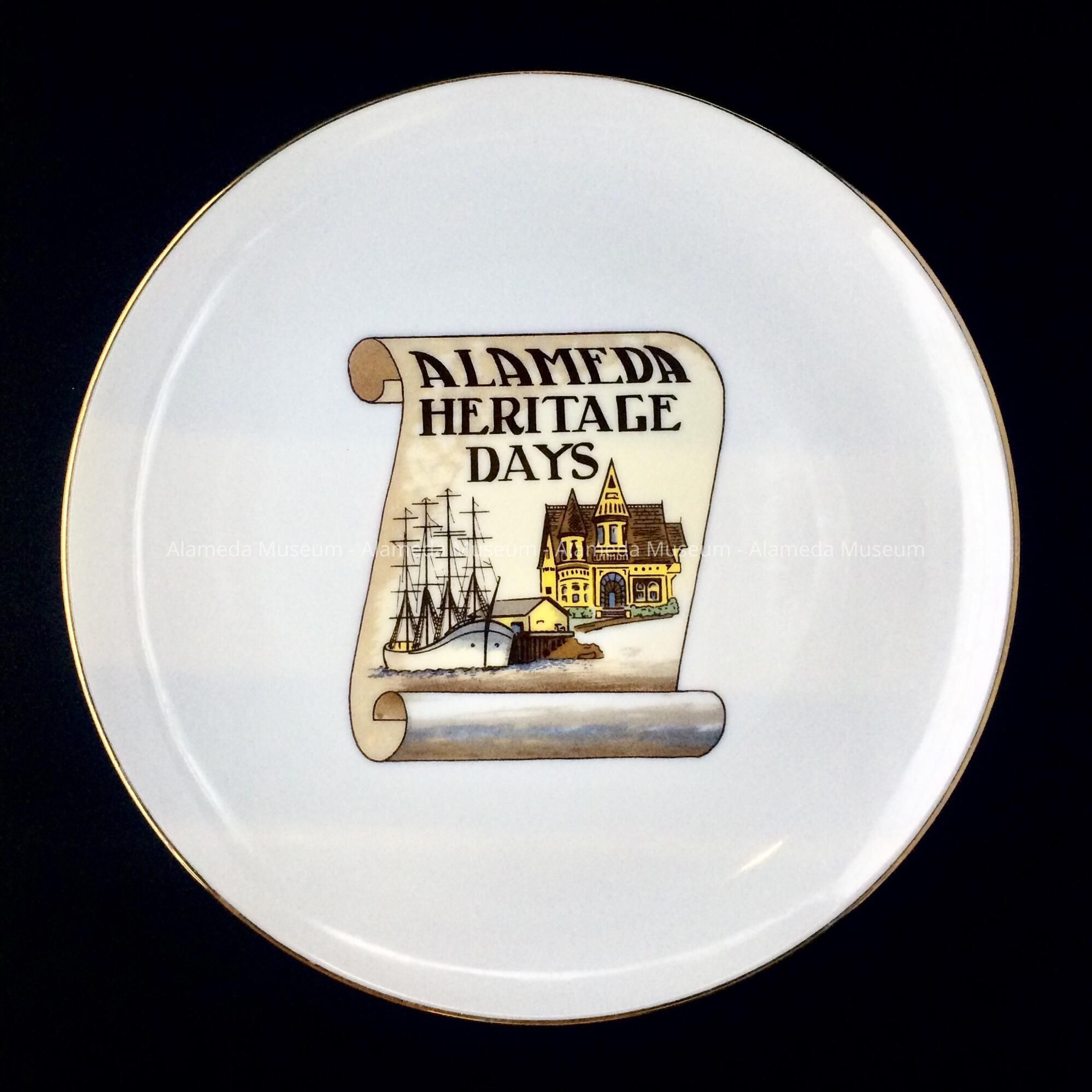 Description: White porcelain plate, gold edge, with transfer center depicting rolled out scroll, bold caption "Alameda Heritage Days" and illustration of Victorian house and a sailing ship. On the reverse is a monochromatic outline of the same image, with to the left 'May 27 Thru' and on the right 'July 4, 1978', and underneath the text: 'This commemorative plate is dedicated to those pioneers, past and present, who have made Alameda, California, the beautiful Isle City. Limited Edition'. In gold: '165/500'.