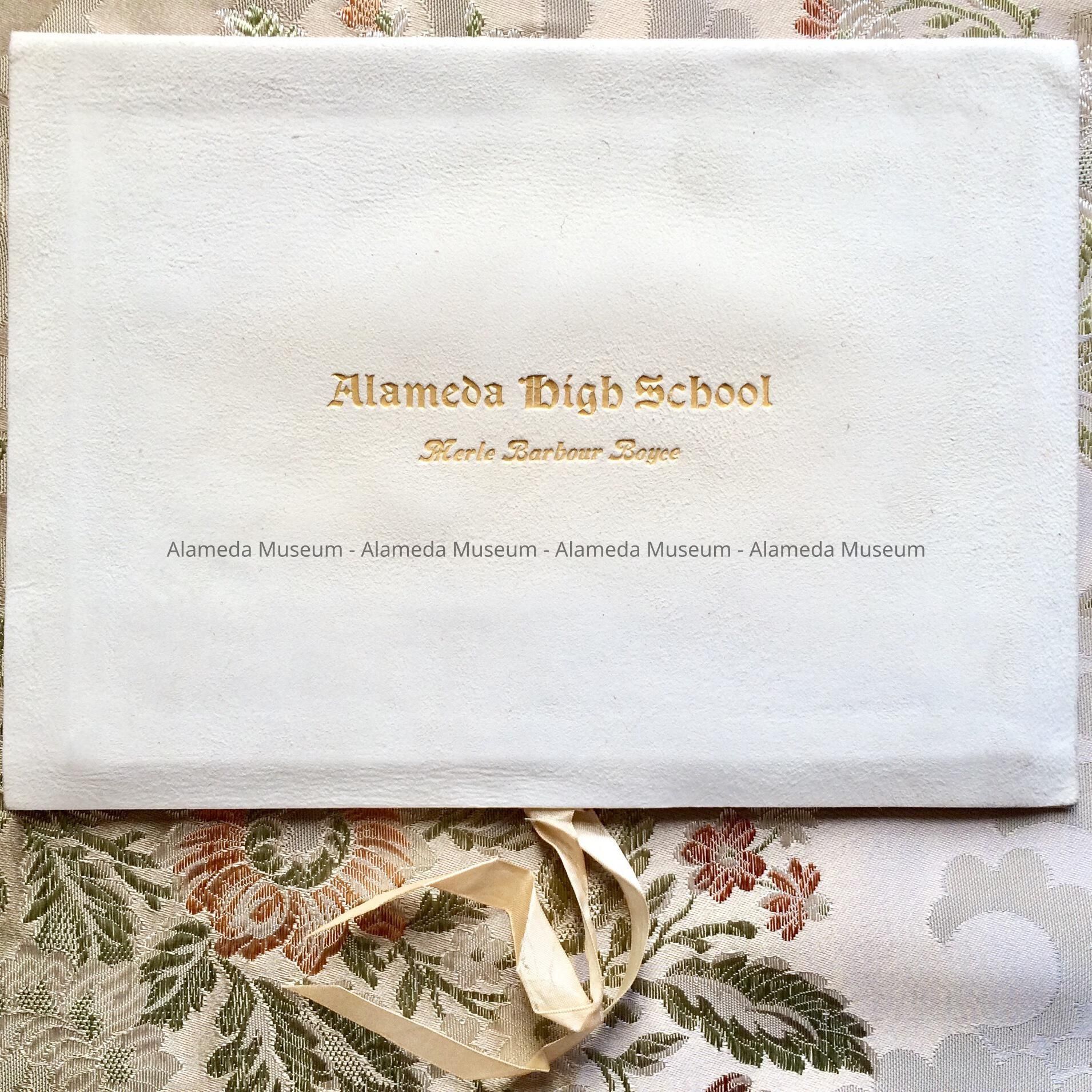 Description: Diploma printed on imitation parchment paper with elaborate type, enclosed in a silk lined kid leather (white) cover (or case). Incised gold lettering on cover "Alameda High School,' & name Merle Barbour Boyce (recipient of diploma).