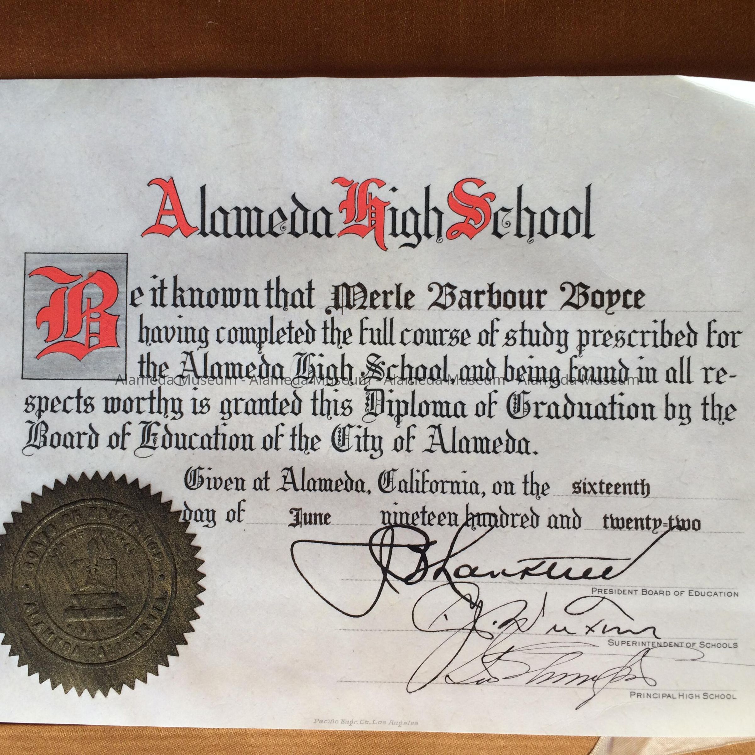 History of Object: Diploma awarded Merle Barbour Boyce from the Alameda High School, dated June 16th, 1922.
