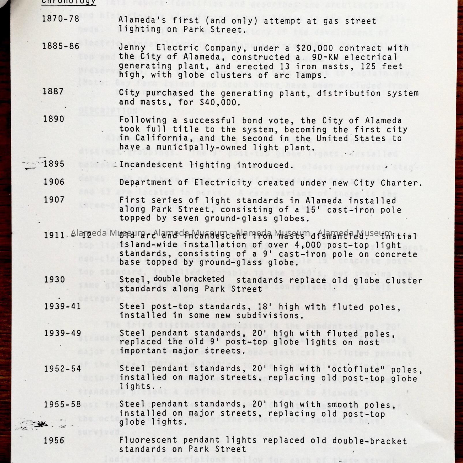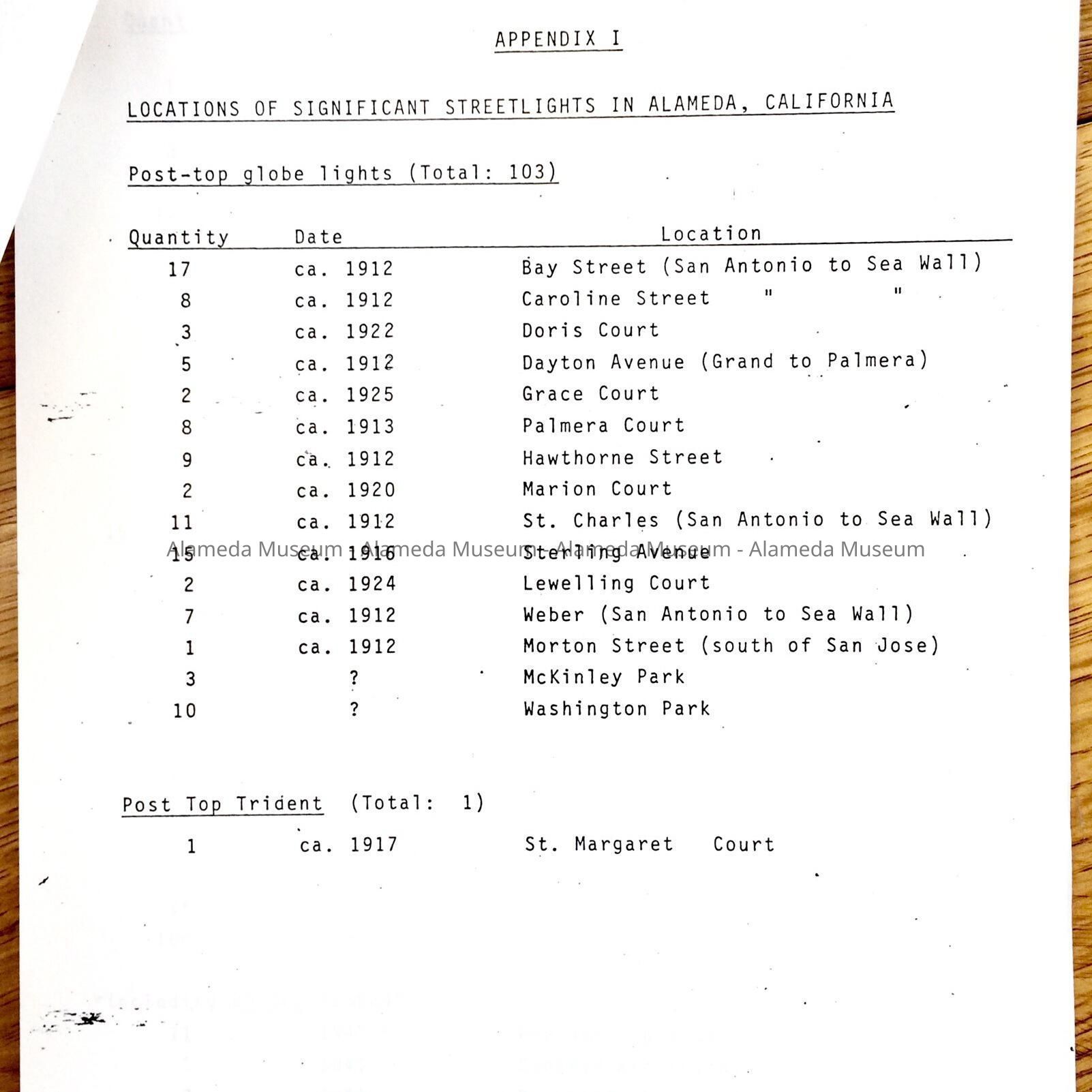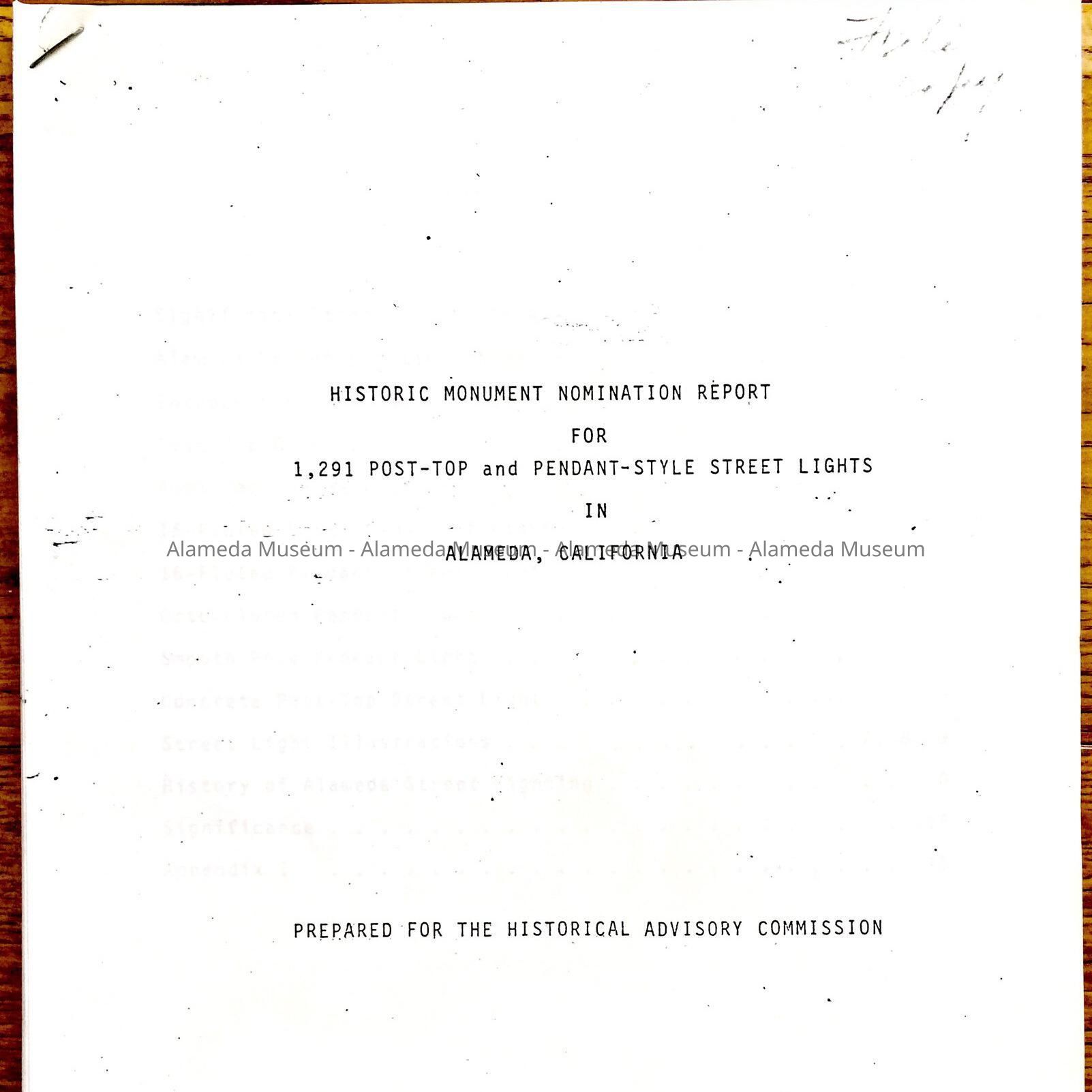 Illustrated report prepared for the Historical Advisory Committee concerning 1291 post-top and pendant style street lights in Alameda. Report was initiated for the inclusion of the street lighting as Historical Monuments. Report also includes chronology of Alameda street lights.