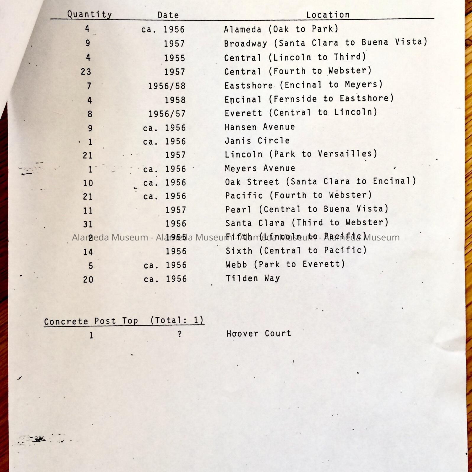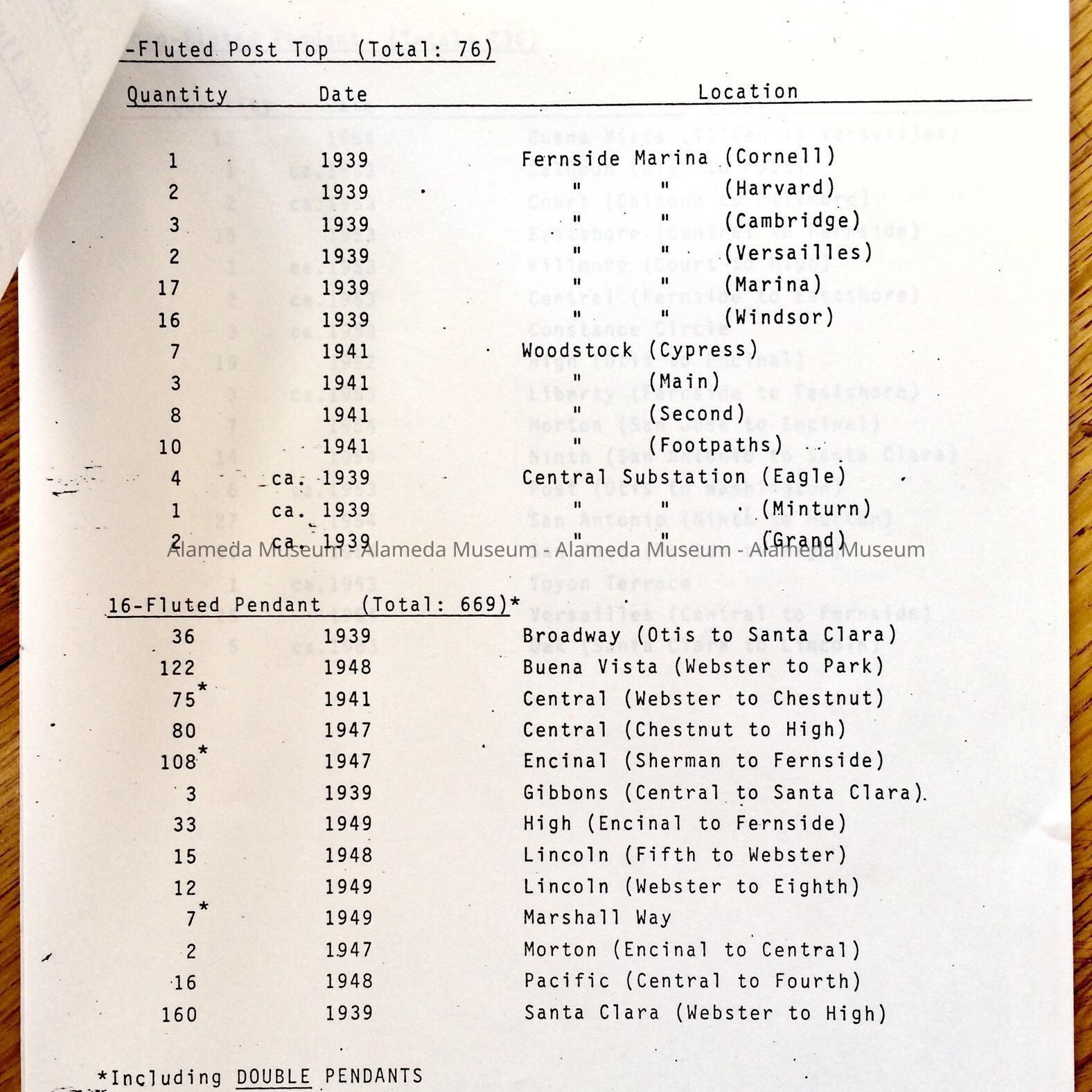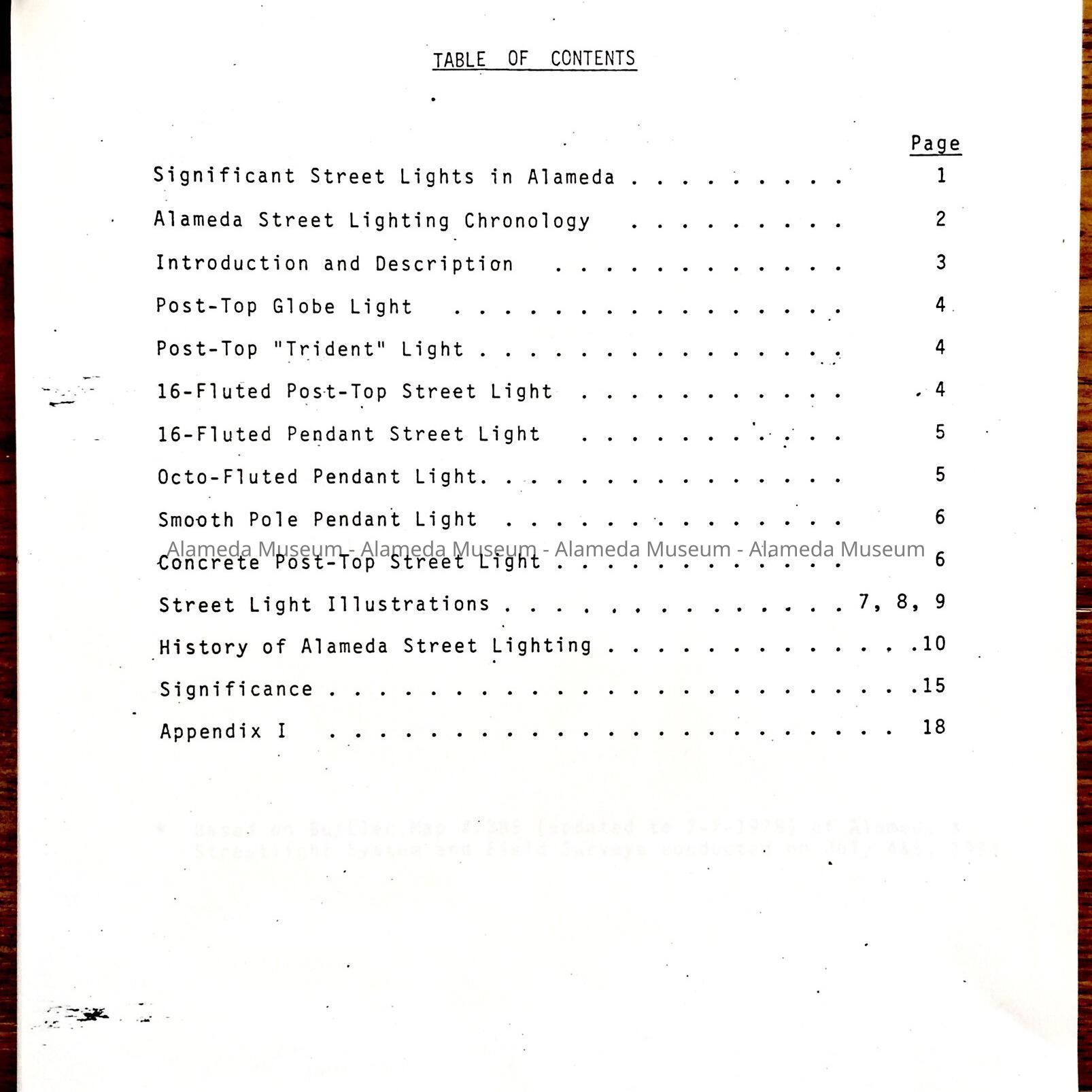 Illustrated report prepared for the Historical Advisory Committee concerning 1291 post-top and pendant style street lights in Alameda. Report was initiated for the inclusion of the street lighting as Historical Monuments. Report also includes chronology of Alameda street lights.