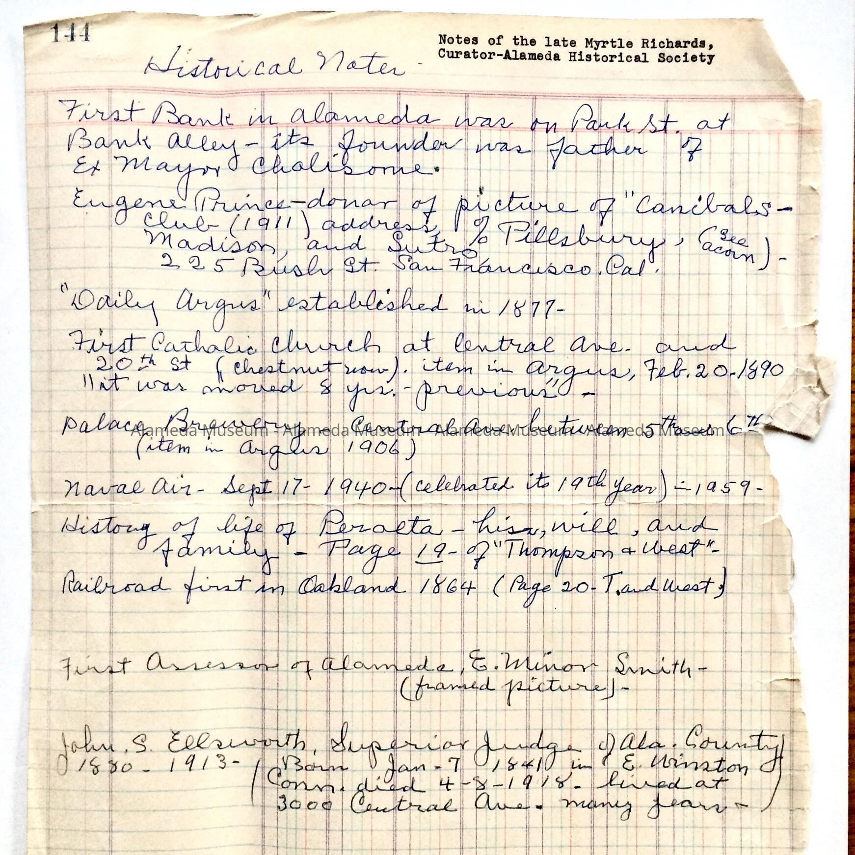 HISTORY OF OBJECT: HANDWRITTEN NOTES PREPARED BY THE LATE MYRTLE RICHARDS, CURATOR OF THE ALAMEDA HISTORICAL SOCIETY. THE NOTES INCLUDED INFORMATION ON THE BANK OF ALAMEDA, FIRST CATHOLIC CHURCH, JUDGE JOHN S ELLSWORTH (CURATOR).