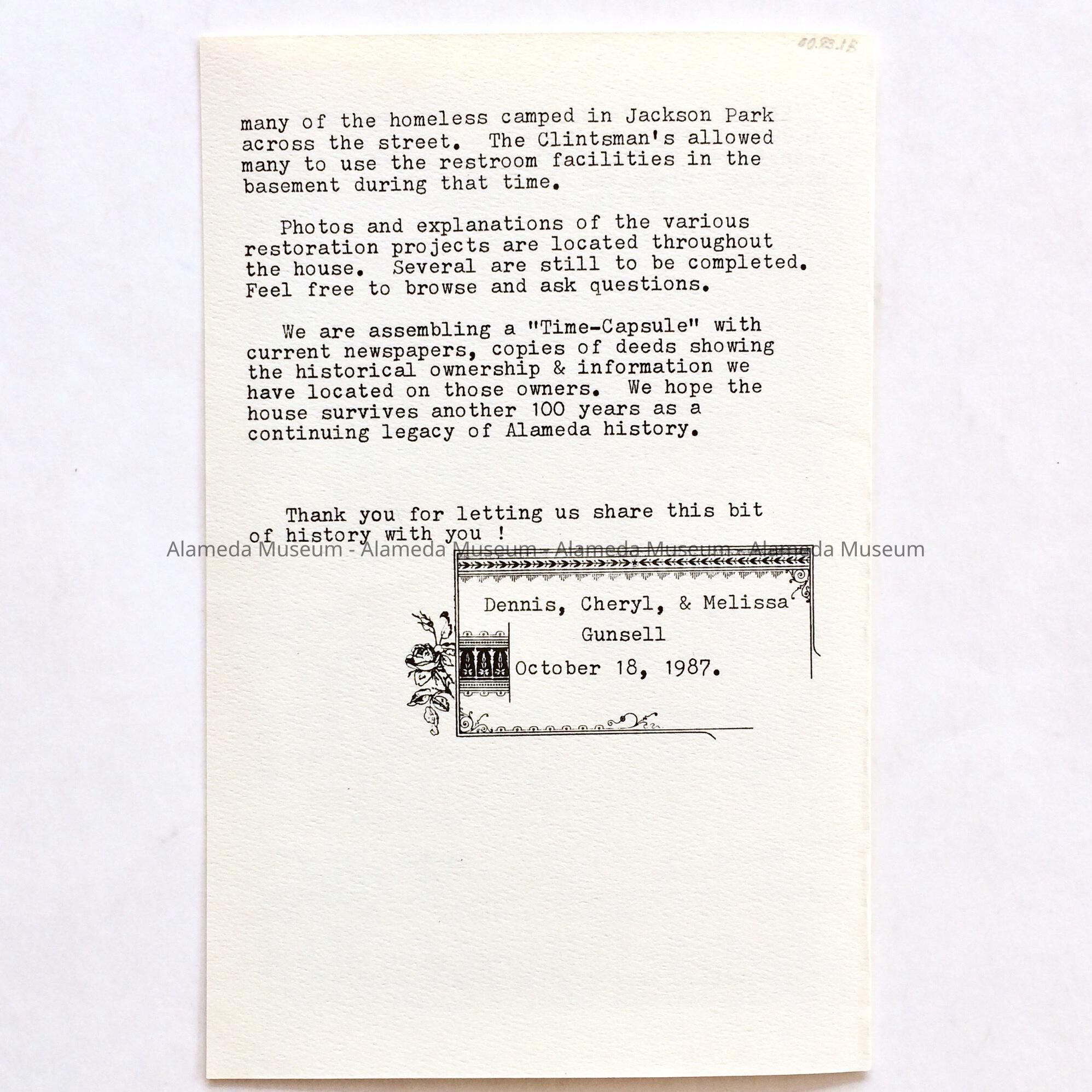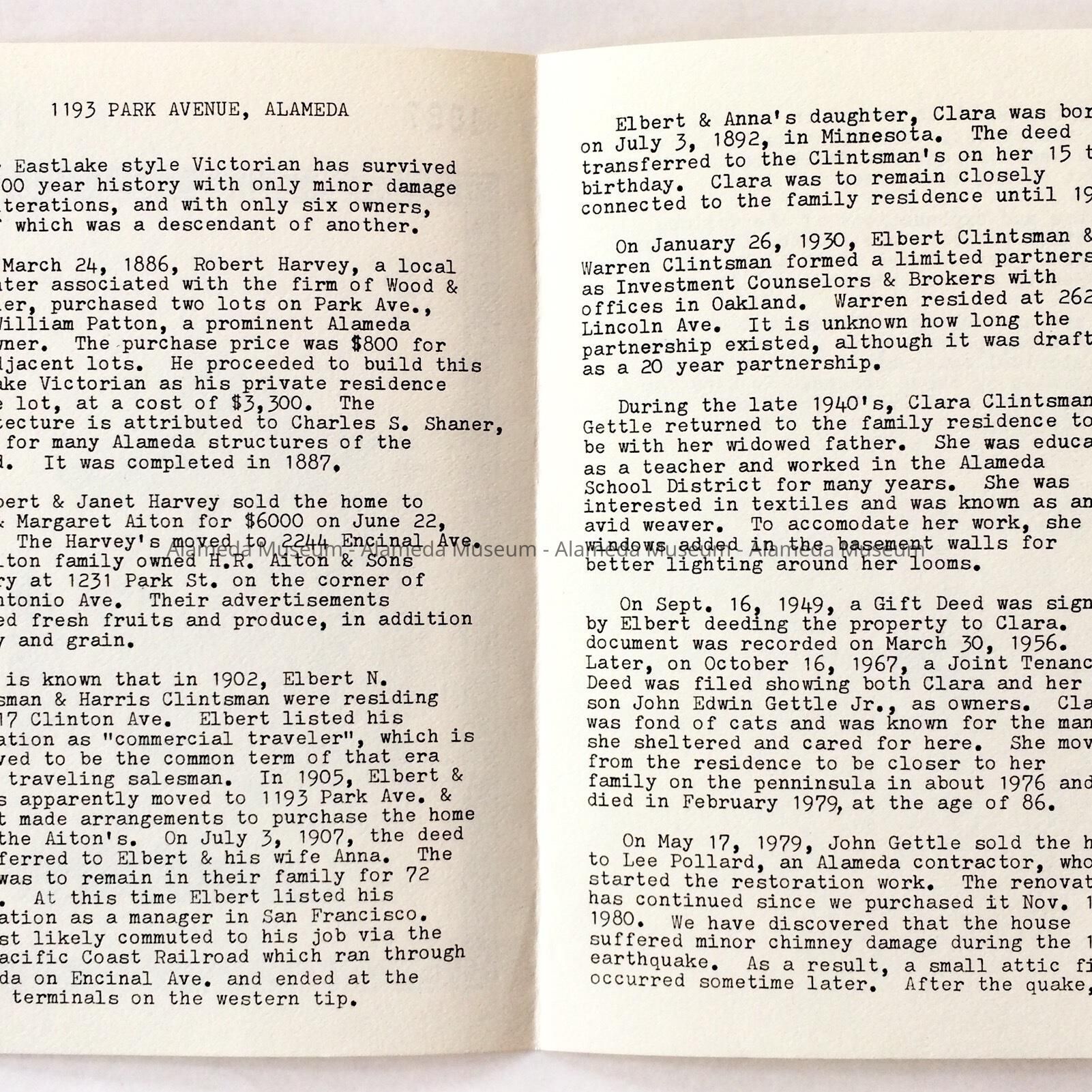 Booklet concerning the history of 1193 Park Avenue, erected 1887. The booklet was created for the 100th anniversary of the home's construction — 1887-1987 — by the donors.