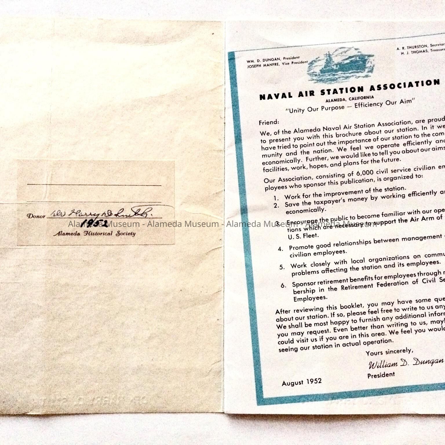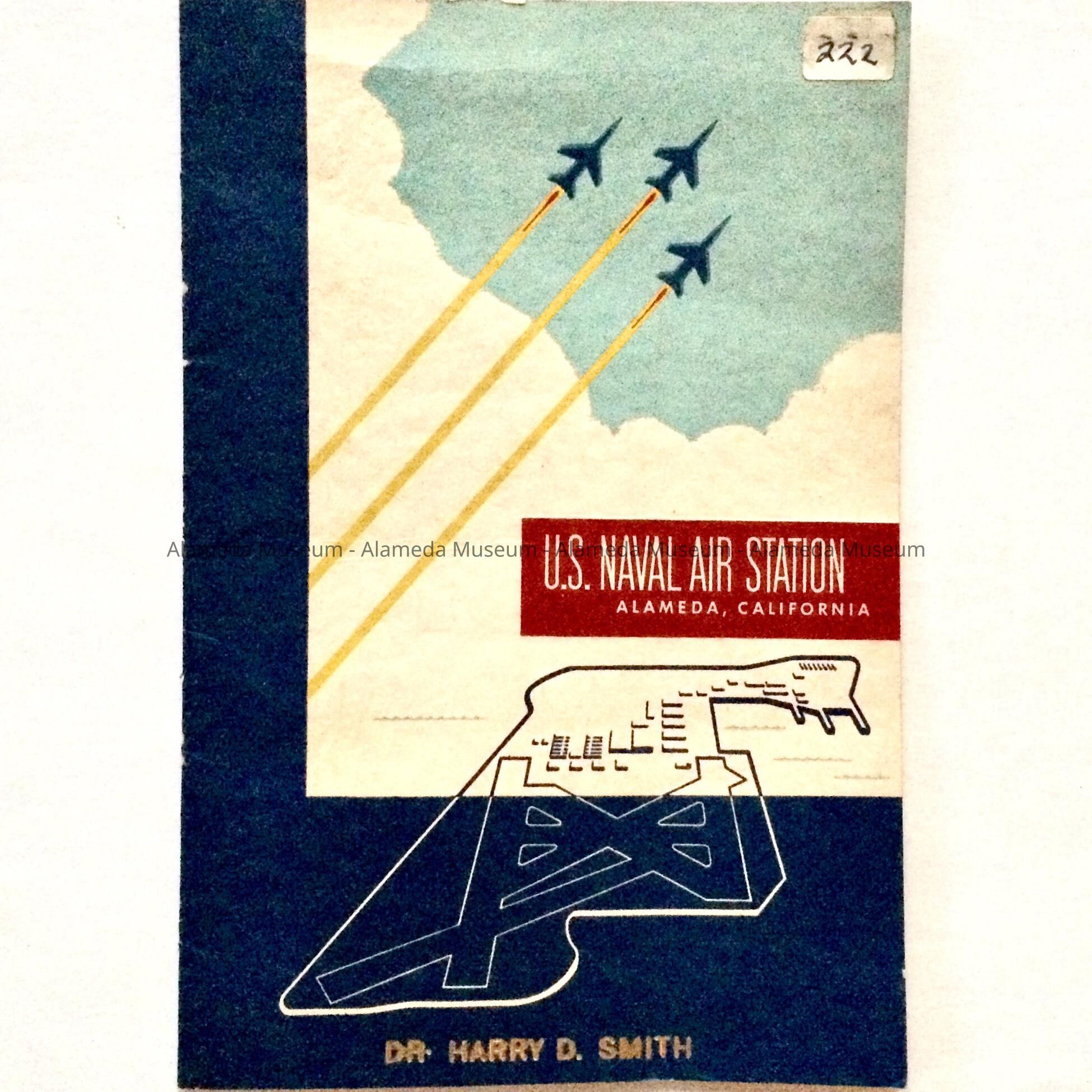 History: Illustrated booklet entitled US NAS. The text describes operations that took place there. This particular copy is engraved with the name of Dr. Harry D. Smith, first Curator of the Alameda Historical Society who donated the booklet in 1952.
