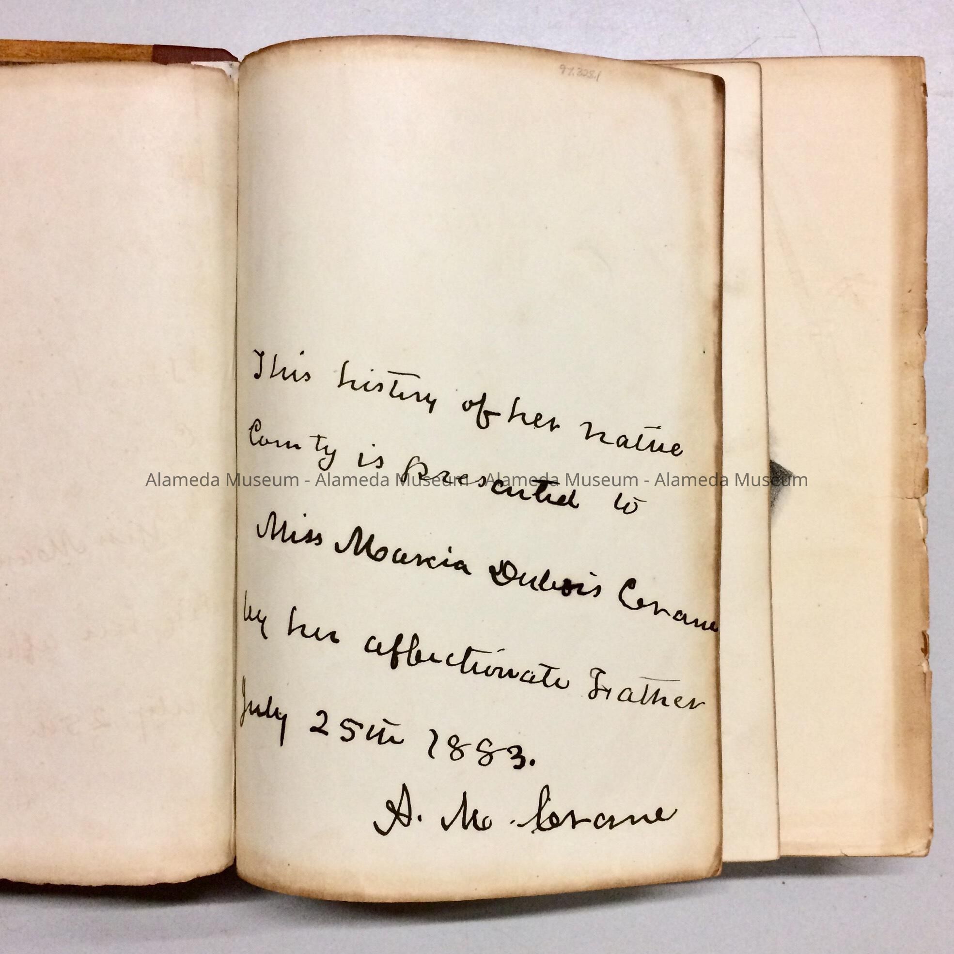 BOOK ENTITLED, "HISTORY OF ALAMEDA COUNTY, CALIFORNIA," BY M W WOOD, PUBLISHER, OAKLAND, CALIFORNIA, 1883. HISTORY OF ALAMEDA TOWNSHIP IS INCLUDED ON PAGE 372. VOLUME WAS PRESENTED TO THE ALAMEDA HISTORICAL MUSEUM IN THE 1950'S AND NOT CATALOGED UNTIL 1997.