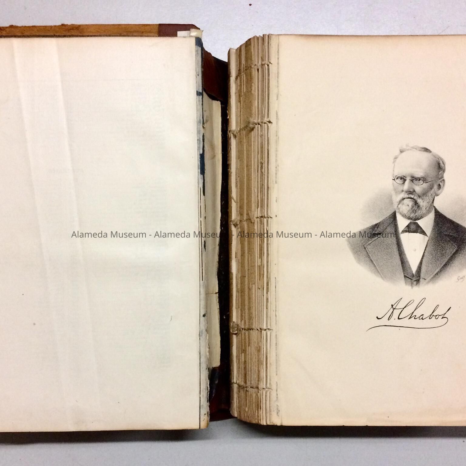 HARD-BOUND BOOK, WITH BINDING OF LIGHT BROWN-COLORED LEATHER. SPINE IS MISSING. BOOK IS "HISTORY OF ALAMEDA COUNTY, CALIFORNIA."