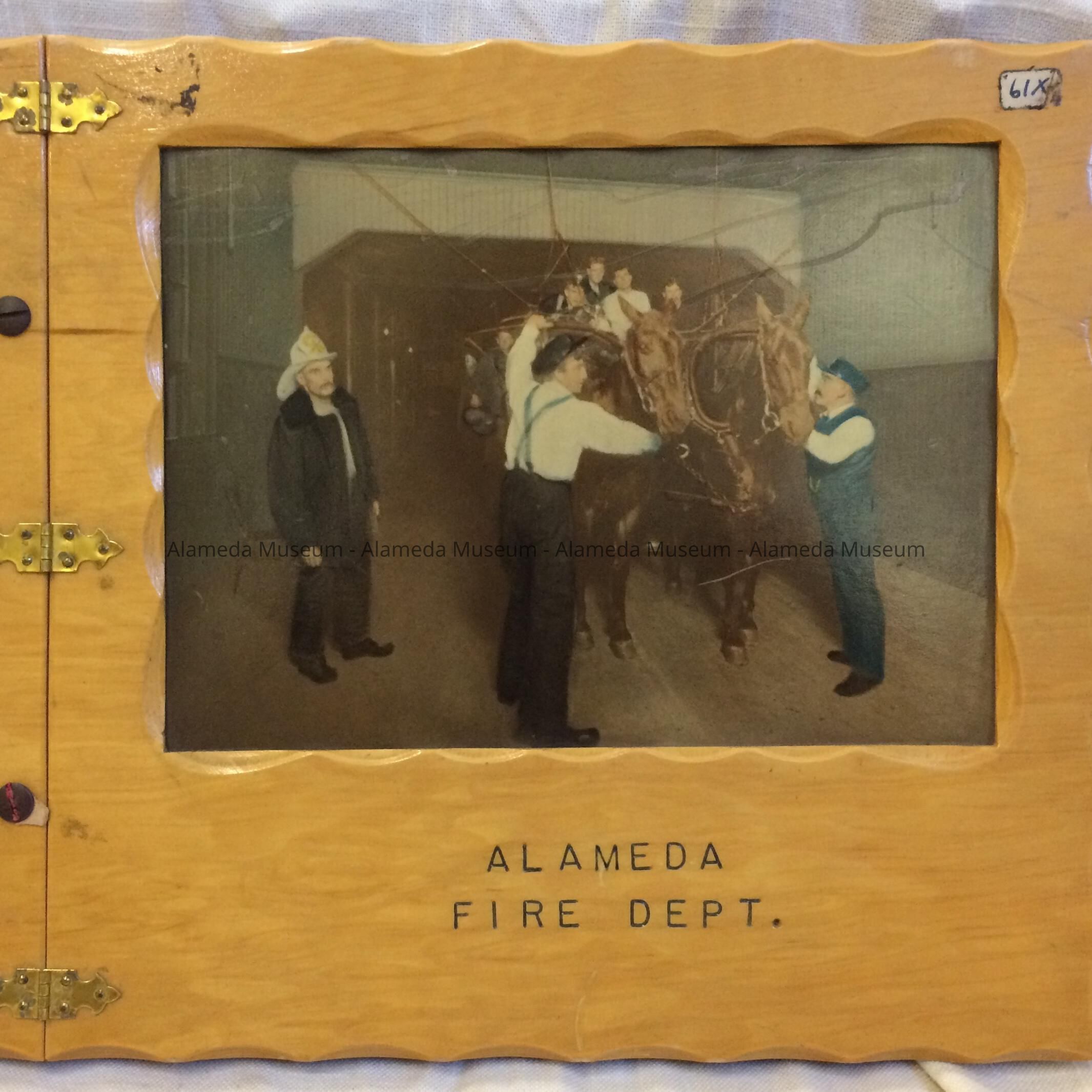 HARD-BOUND LOOSE-LEAF HISTORY. COVER APPEARS TO BE HAND-MADE OF A BLONDE-COLORED HARDWOOD THAT HAS BEEN HIGHLY VARNISHED. COVER DESIGN OF WHAT APPEARS TO BE A HAND-COLORED PHOTOGRAPH. INCISED CAPTION, "ALAMEDA FIRE DEPARTMENT," ON COVER. TEXT TYPEWRITTEN ON BROWN COLORED PAPER.