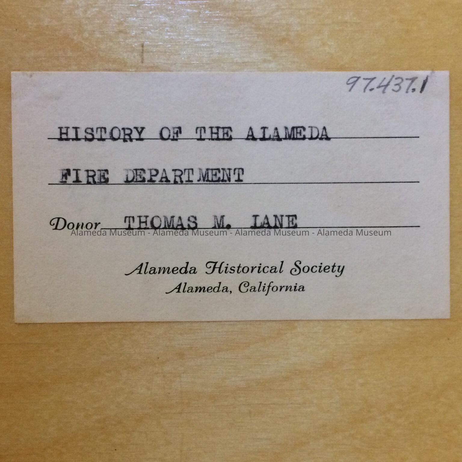 NARRATIVE ENTITLED, "HISTORY OF THE DEVELOPMENT OF ALAMEDA FIRE DEPARTMENT," BY CHIEF THOMAS M LANE. INTRODUCTORY PAGE IS DATED FEBRUARY 1, 1956, AND SIGNED BY THE FORMER FIRE CHIEF. ALBUM WAS GIVEN TO THE ALAMEDA HISTORICAL SOCIETY, NUMBERED "61-X," AND NEVER OFFICIALLY CATALOGED.