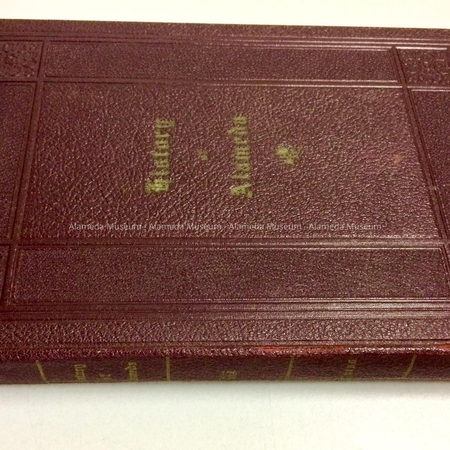 HARD-BOUND BOOK, WITH COVER OF DARK MAROON-COLORED IMITATION LEATHER, WITH INCISED LETTERING, "HISTORY OF ALAMEDA," IN GOLD-COLORED TYPE ON COVER AND SPINE. ARTHUR H CAWSTON, MANAGING EDITOR AND PUBLISHER, ALAMEDA, CALIFORNIA, 1939.