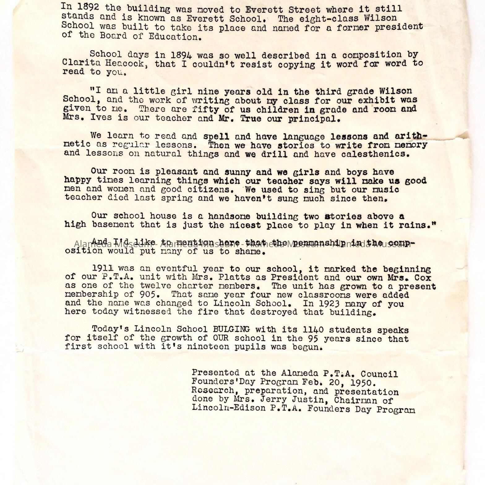 HISTORY OF OBJECT: A HISTORY OF LINCOLN SCHOOL (1855-1950). REPORT WAS PRESENTED TO ALAMEDA PTA COUNCIL, WRITTEN BY MRS JERRY JUSTIN, AND PRESENTED TO THE ALAMEDA HISTORICAL MUSEUM BEFORE 1971, NUMBERED "331," AND NOT CATALOGED UNTIL THIS DATE IN 1999.