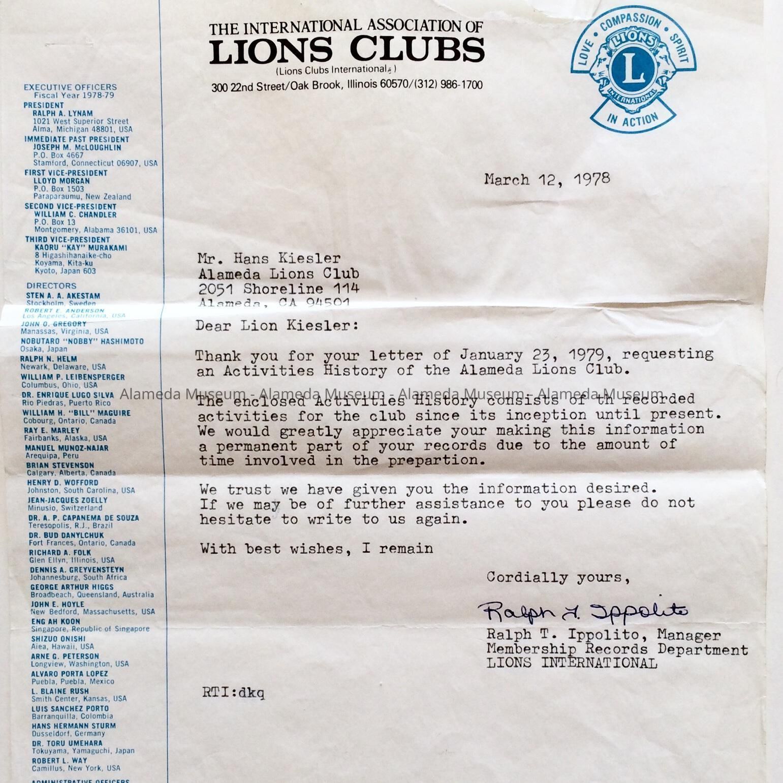 Description: Letter with two pages of dated paragraphs, on stationery of the International Association of Lions Clubs, Illinois, signed by Ralph T. Ippolito, Manager Membership Records Department, and addressed to Mr. Hans Kiesler, Alameda Lions Club, 2051 Shoreline 114, Alameda, dated March 12, 1978.