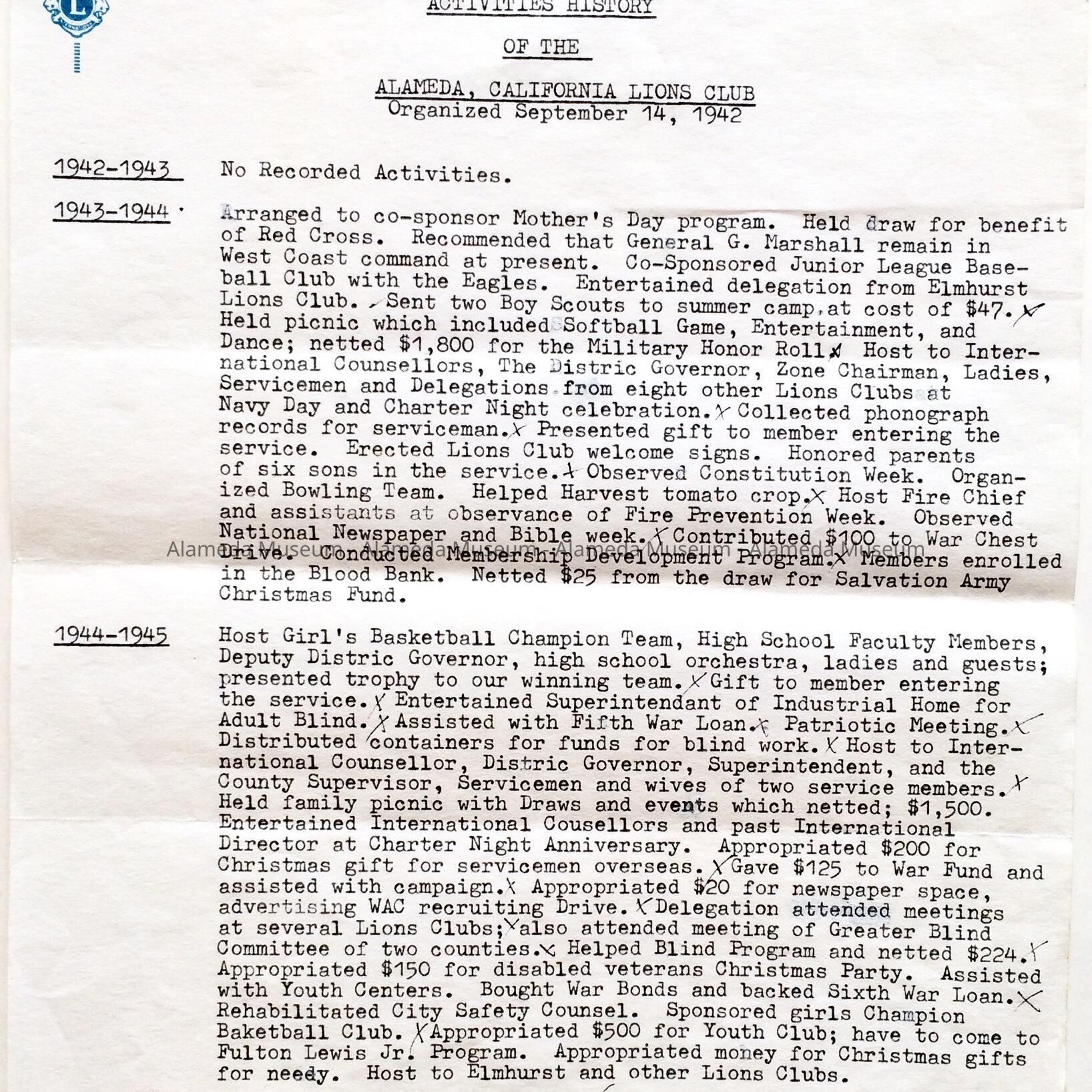 History of Object: Activity History of the Alameda Lions Club, 1942-1976, composed by the membership records department of Lions International, in reply to a request from Hans Kiesler from January 23, 1979, with admonition to retain the documents. Note that one of the years must be in error (for the response cannot have been a year and 2 months before the request).
