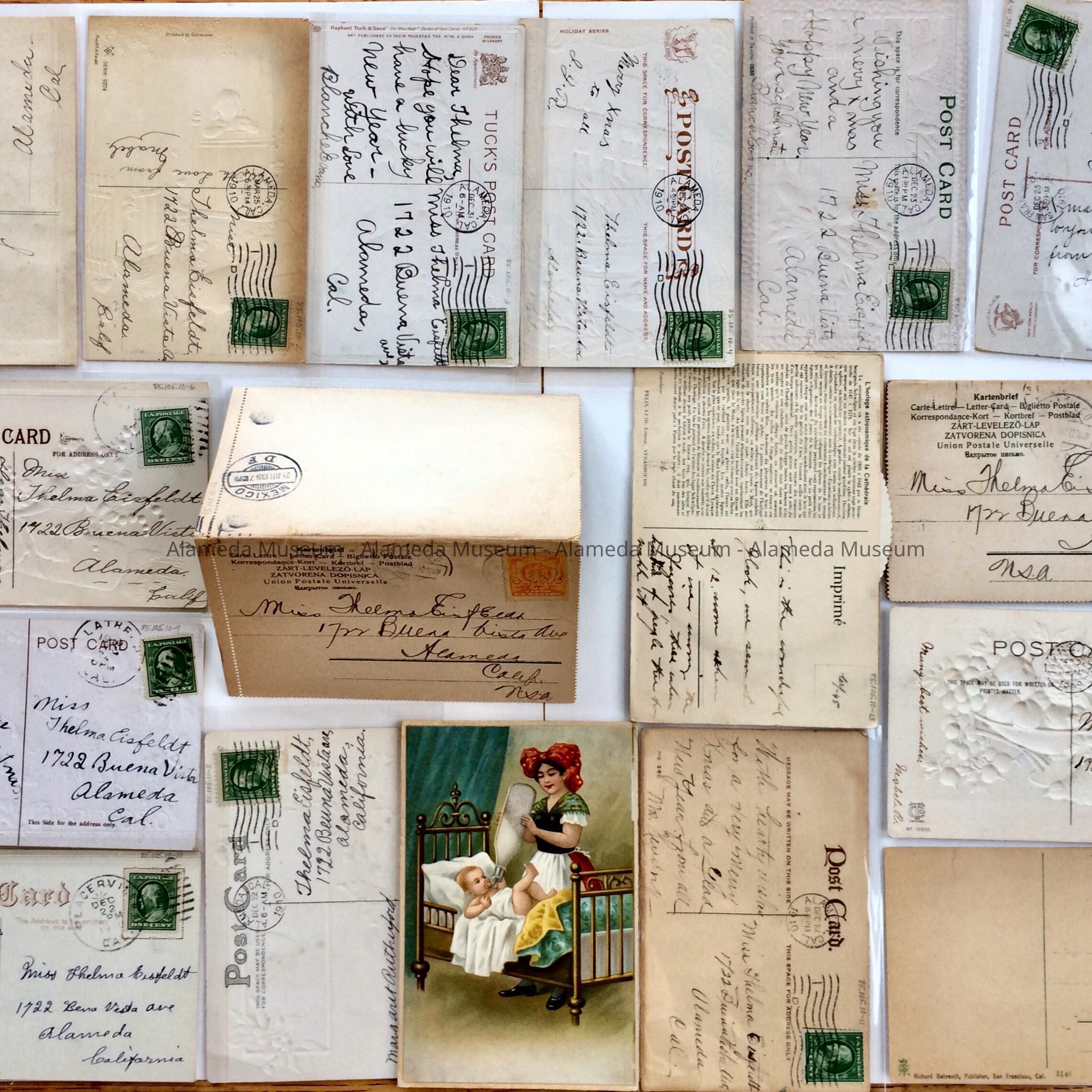 History of Object: Assorted holiday postcards sent to Thelma Eisfeldt as a child, 1722 Buena Vista Avenue, Alameda. Miss. Eisfeldt was raised in Alameda, attended the Alameda Sanatorium school of nursing, and died while serving as a Red Cross nurse in France during World War 1.