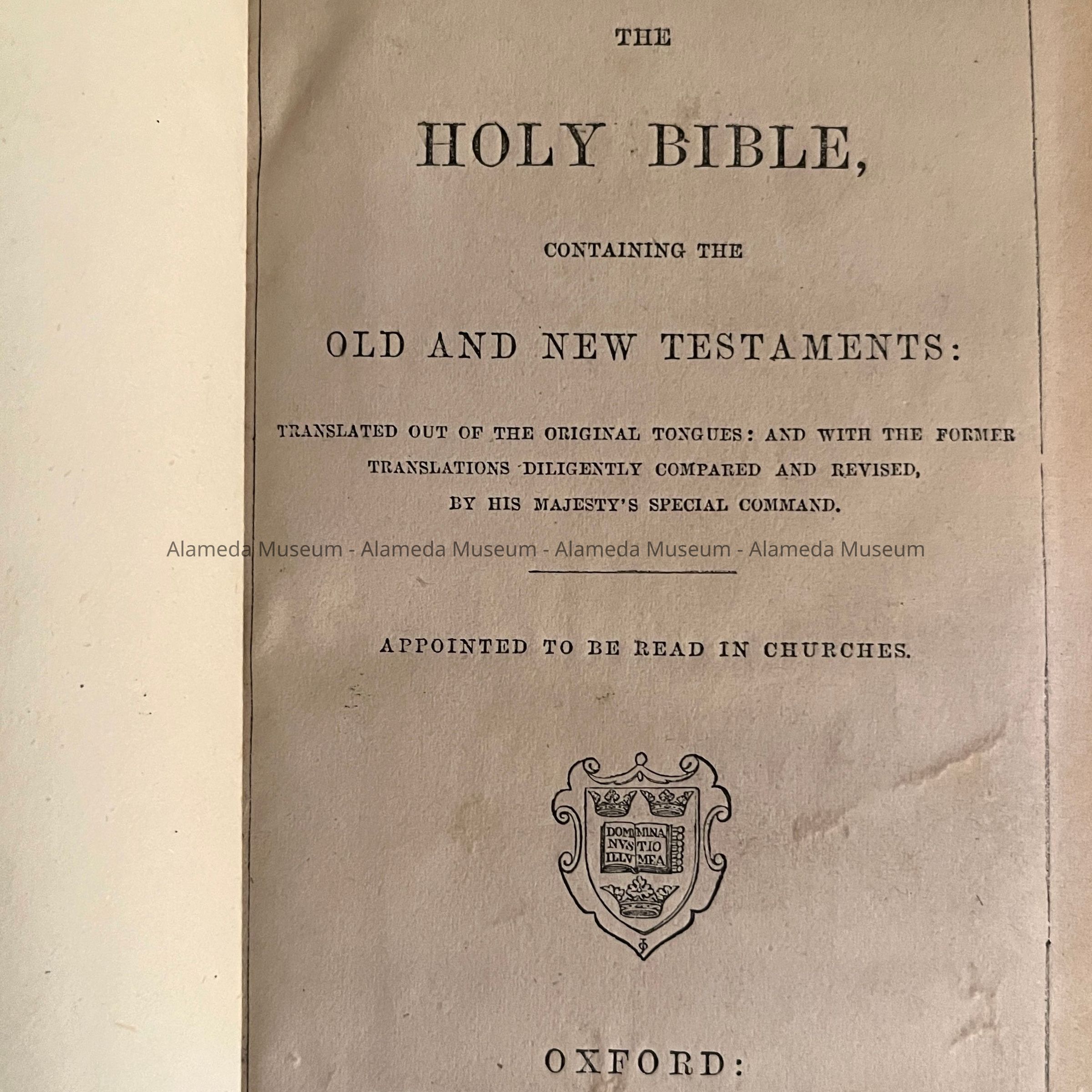 Description: Hard bound bible, cover is imitation leather. Cover caption in incised gold lettering stating Holy Bible, Cover edge and clasp trimmed in brass.