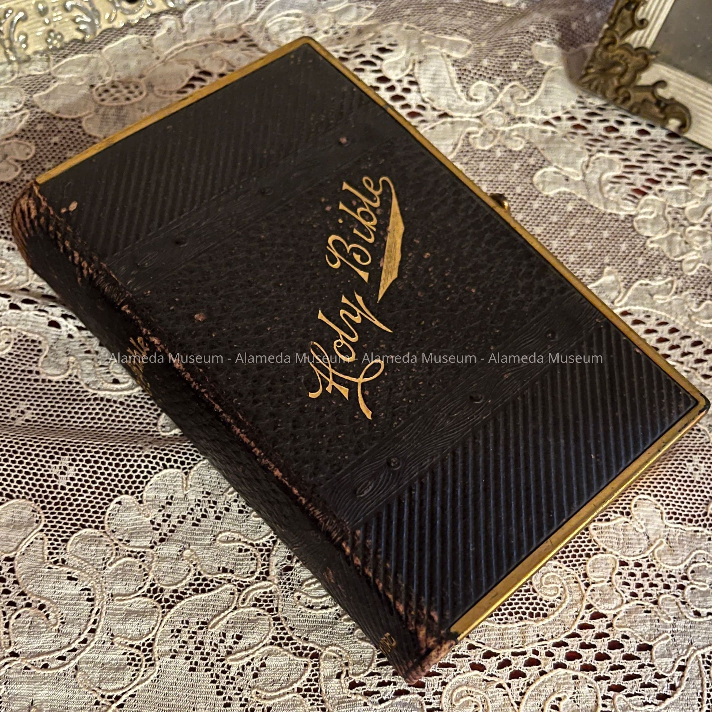 Holy Bible with imitation leather cover with gold lettering and brass trim, c. 1889Entry/Object ID