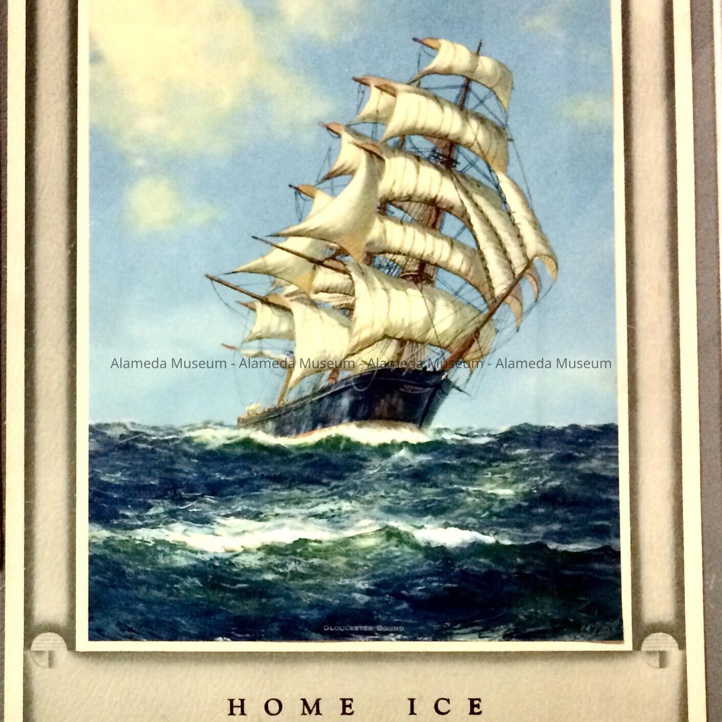 Colored lithographic calendar with bold printed heading: HOME ICE, FUEL, AND SUPPLY COMPANY. Calendar illustration of 3-masted sailing ship.